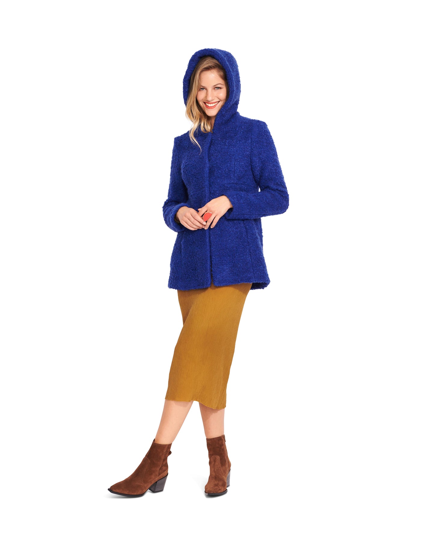Mit dieser kuscheligen Jacke bzw. einem Kurzmantel mit Kapuze ist man im Winter immer gut angezogen. Die ungefütterten Überzieher sind mit Nahttaschen ausgestattet und haben eine leichte A-Linie. Eine großzügige Kapuze und ein Bindegürtel nach Wunsch unterstreicht den lässigen Stil.