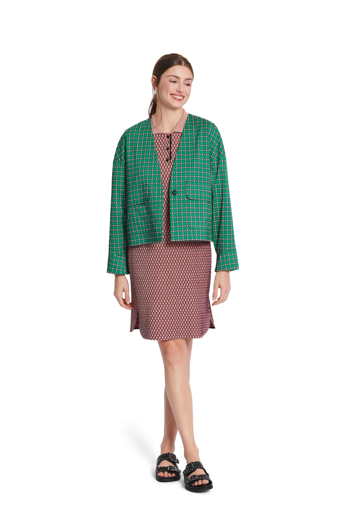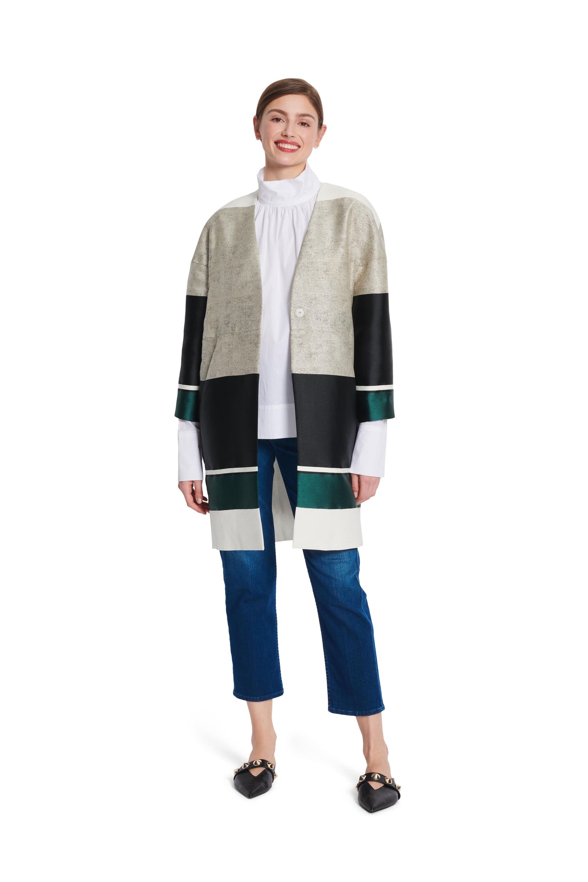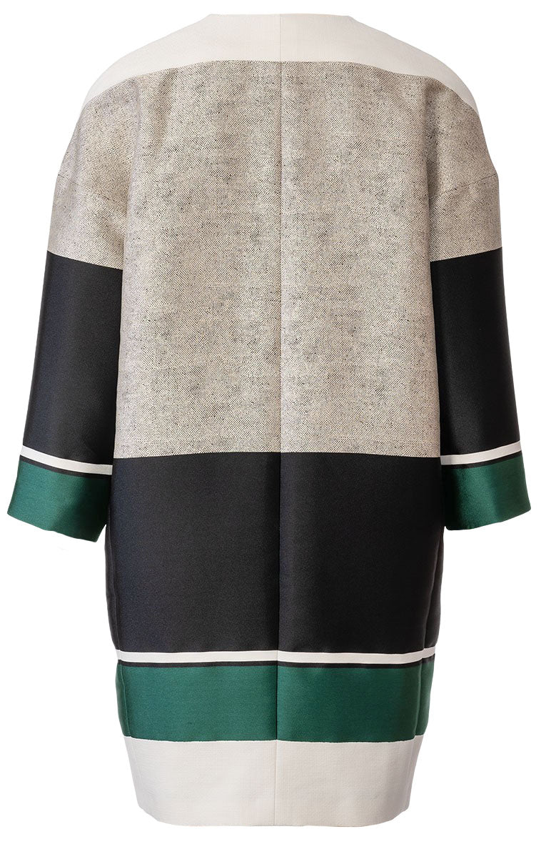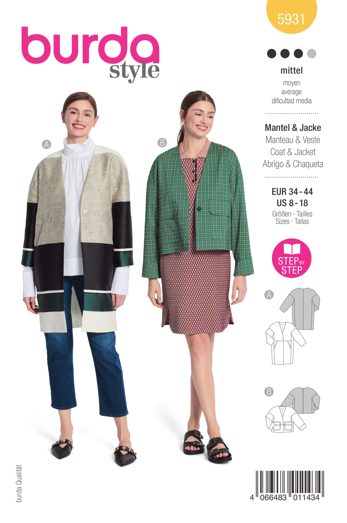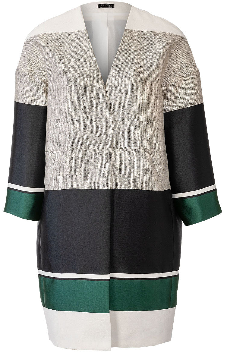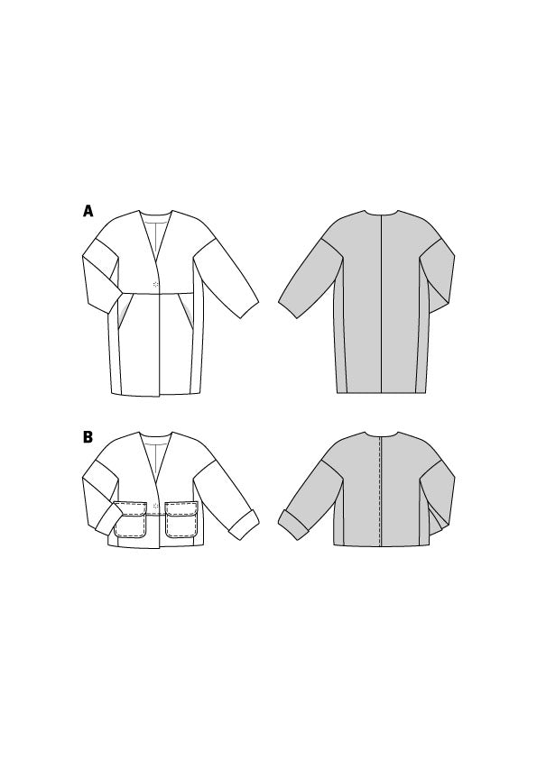 Mantel und Jacke in schnökelloser aber raffinierter Schnittführung. Beide sind kragenlos, gefüttert und werden mit einem Druckknopf geschlossen. Der knielange Mantel A in leichter Egg-Shape-Optik hat eingearbeitete Taschen. Die kurze Jacke B mit Ärmelaufschlägen glänzt mit aufgesetzten Klappentaschen.