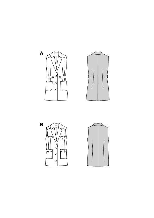 Stoffempfehlung:Popeline, Gabardine, Leinen, leichte Wollstoffe A: Einlage, Knopf B: Einlage, Knopf, Druckknopf