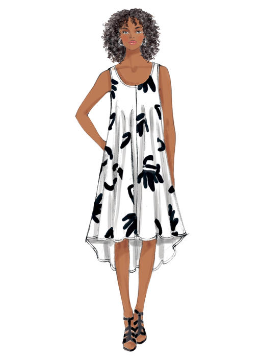 Pullover, sehr locker sitzendes, ausgestelltes Kleid mit Rundhalsausschnitt, Seitennahttaschen, schrägen Hals- und Armausschnittblenden und schmalem Saum. A: Asymmetrischer Saum e und Schnitt in Querrichtung. B: Hoch-Tief-Saum (falsche Seite zeigt). C: Schulterfreie Ärmel. D: Rüschensaum. A, B, D: Ärmellos.