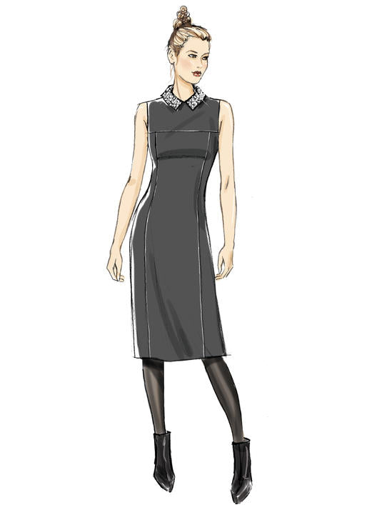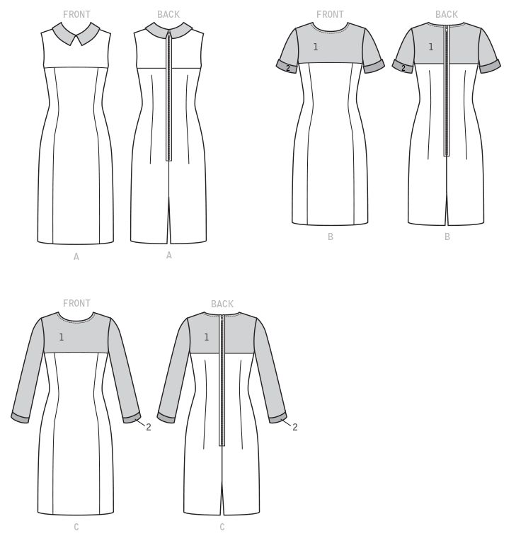 Tailliertes Kleid mit Vorder- und Rückenpasse, Prinzessnähten, Ärmel-, Halsausschnitt- und Längenvariationen. A: Kontrastfarbener Kragen. B, C: Passe, Ärmel und Manschette in Kontrastfarbe.