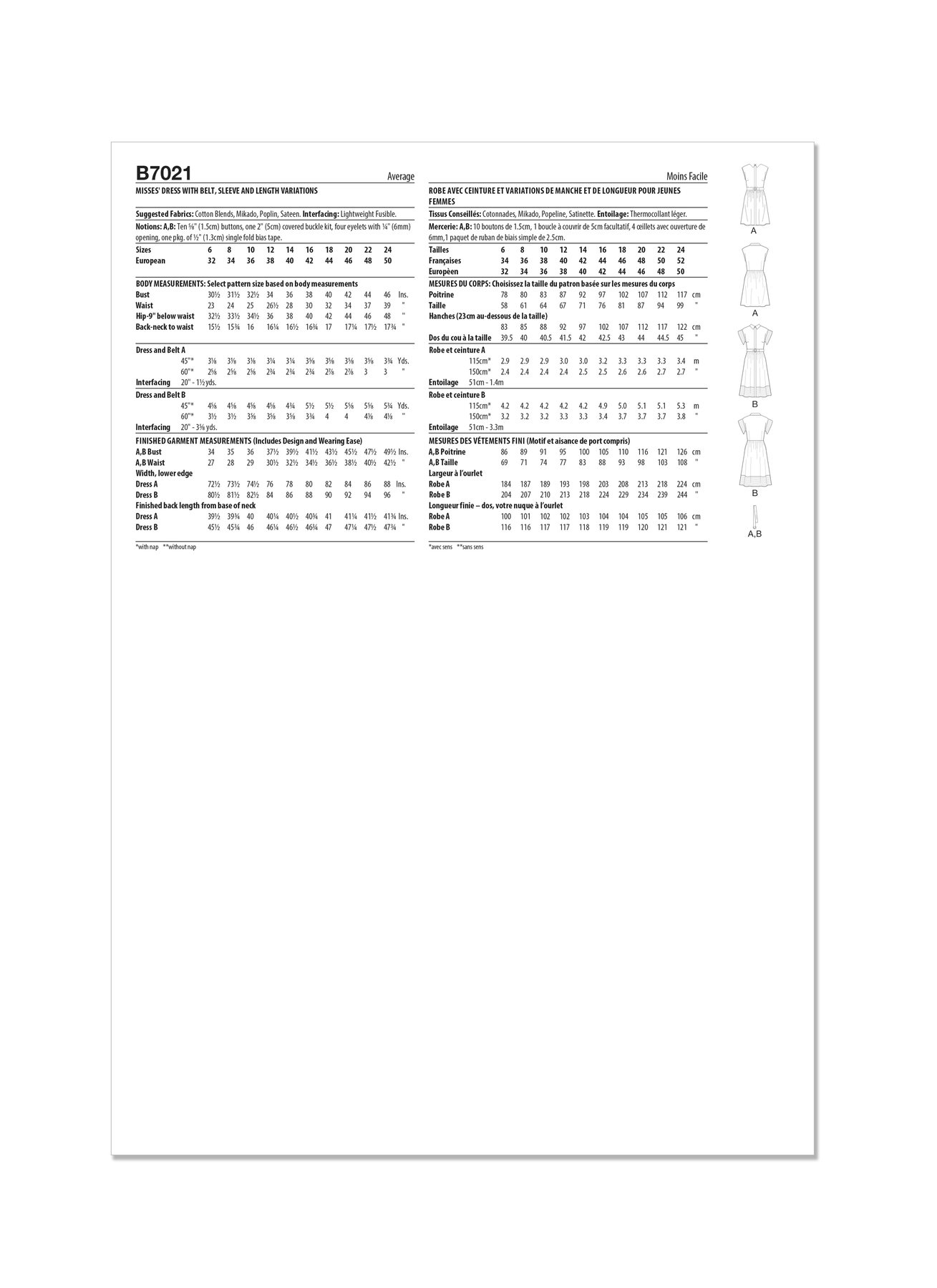 Butterick Schnittmuster B7021 Damen Kleid mit Gürtel, Ärmel- und Längenvariationen
