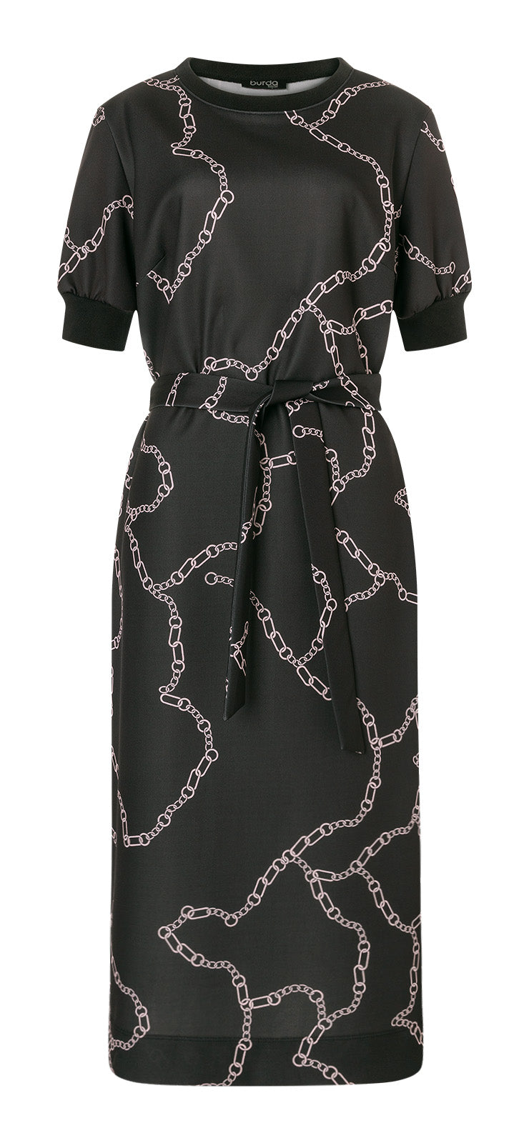 Das Kleid aus Kettenjersey kombiniert schlichte Linien mit raffinierten Details. Fertigbündchen an den Ärmelsäumen sorgen für edles Volumen, während ein schmaler Bindegürtel die Taille betont und eine feminine Silhouette formt.
