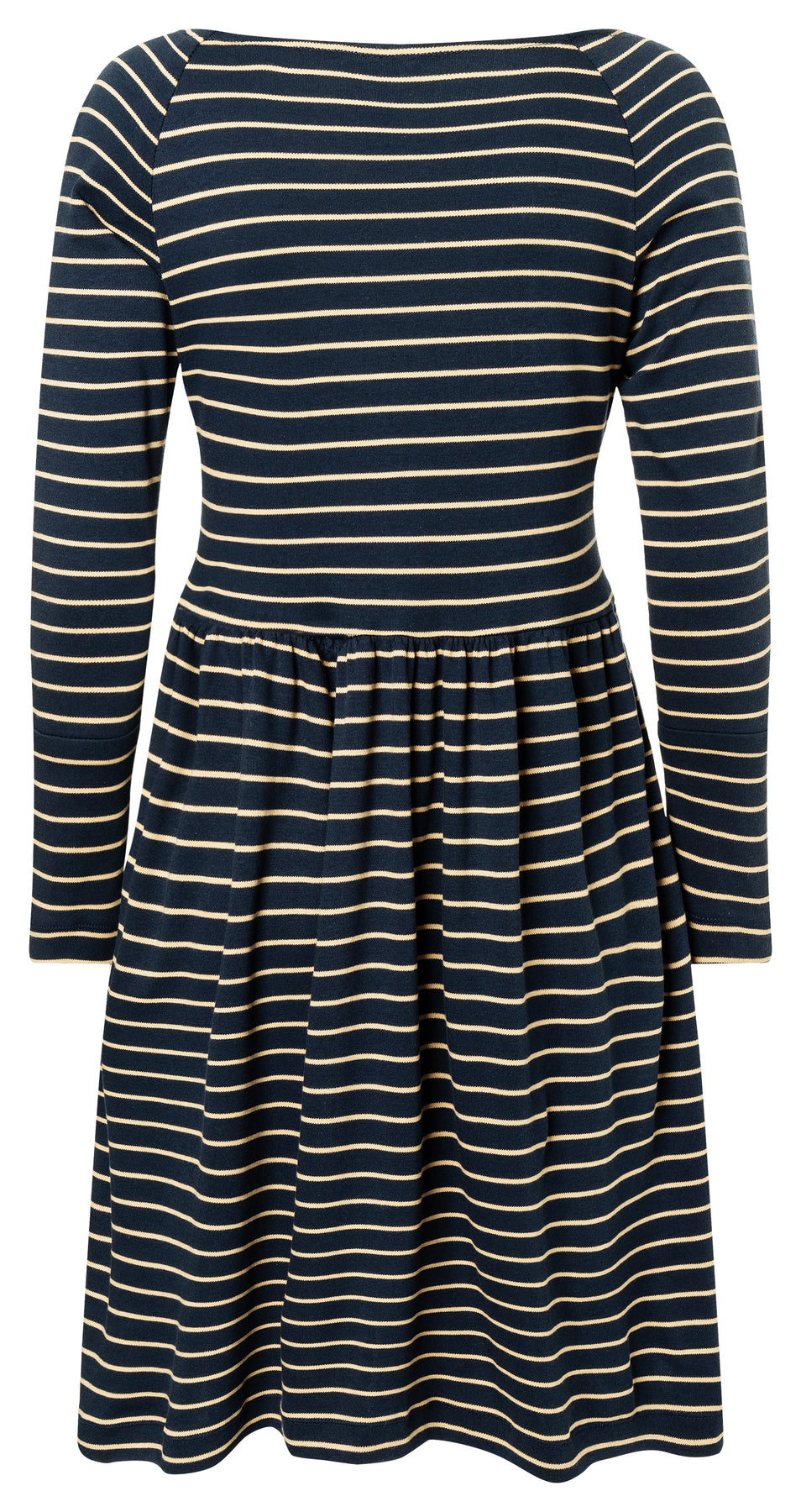 Variante A: Ein gestreiftes Jersey-Kleid mit ausgestelltem Rock und langen Ärmeln – ein zeitloses Must-have für jeden Kleiderschrank.