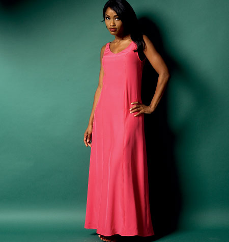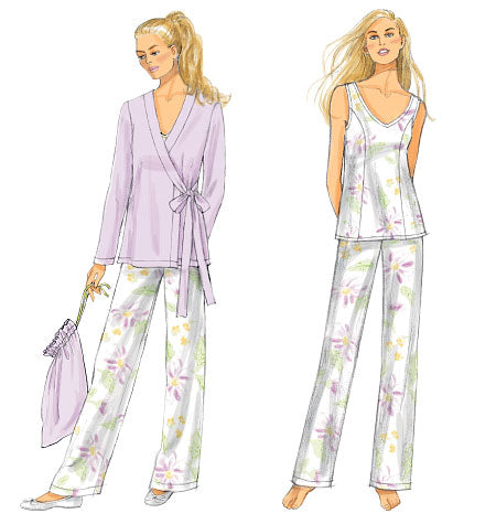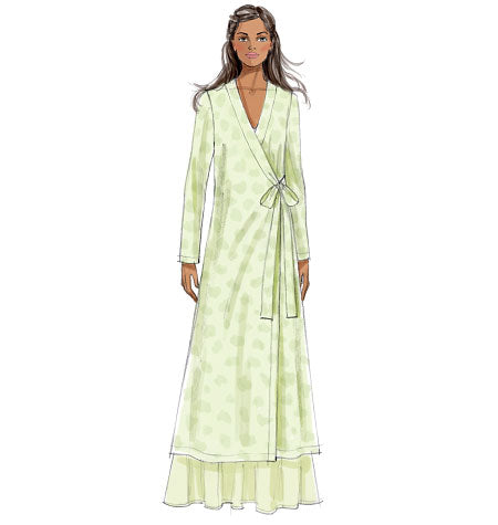 Locker sitzendes Wickelgewand mit Bändern, einem vorderen Band, das in ein rechtes Bindeband mündet, einem linken Bindeband, Seitentaschen und genähten Säumen. Ein tailliertes Oberteil oder Kleid mit Pullover hat Prinzessnähte, Schrägbänder und einen schmalen Saum. Halb taillierte Hosen mit geraden Beinen haben einen elastischen Bund. Die Tasche hat eine gekaufte Bandkordel.