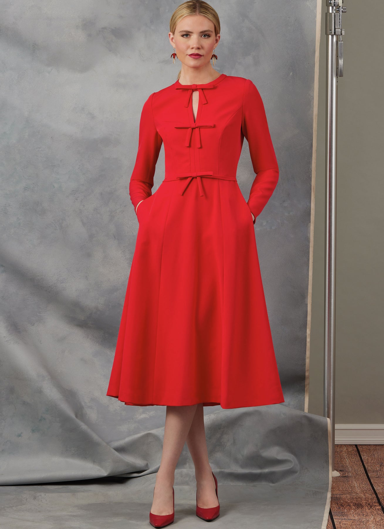 Die gefütterten Kleider sind im Brustbereich eng anliegend, haben Schrägbänder, eine Schleife, ein Mieder mit Prinzessinnennähten, einen Rock mit Lochmuster, einen unsichtbaren Reißverschluss mit Haken und Ösen und Seitennahttaschen. Ansicht A hat lange, spitz zulaufende Ärmel mit Ellbogenabnähern und unsichtbarer Reißverschlussöffnung. Ansicht B hat kurze Ärmel. Separate Schnittmusterteile für die Körbchengrößen A, B, C und D sind enthalten.