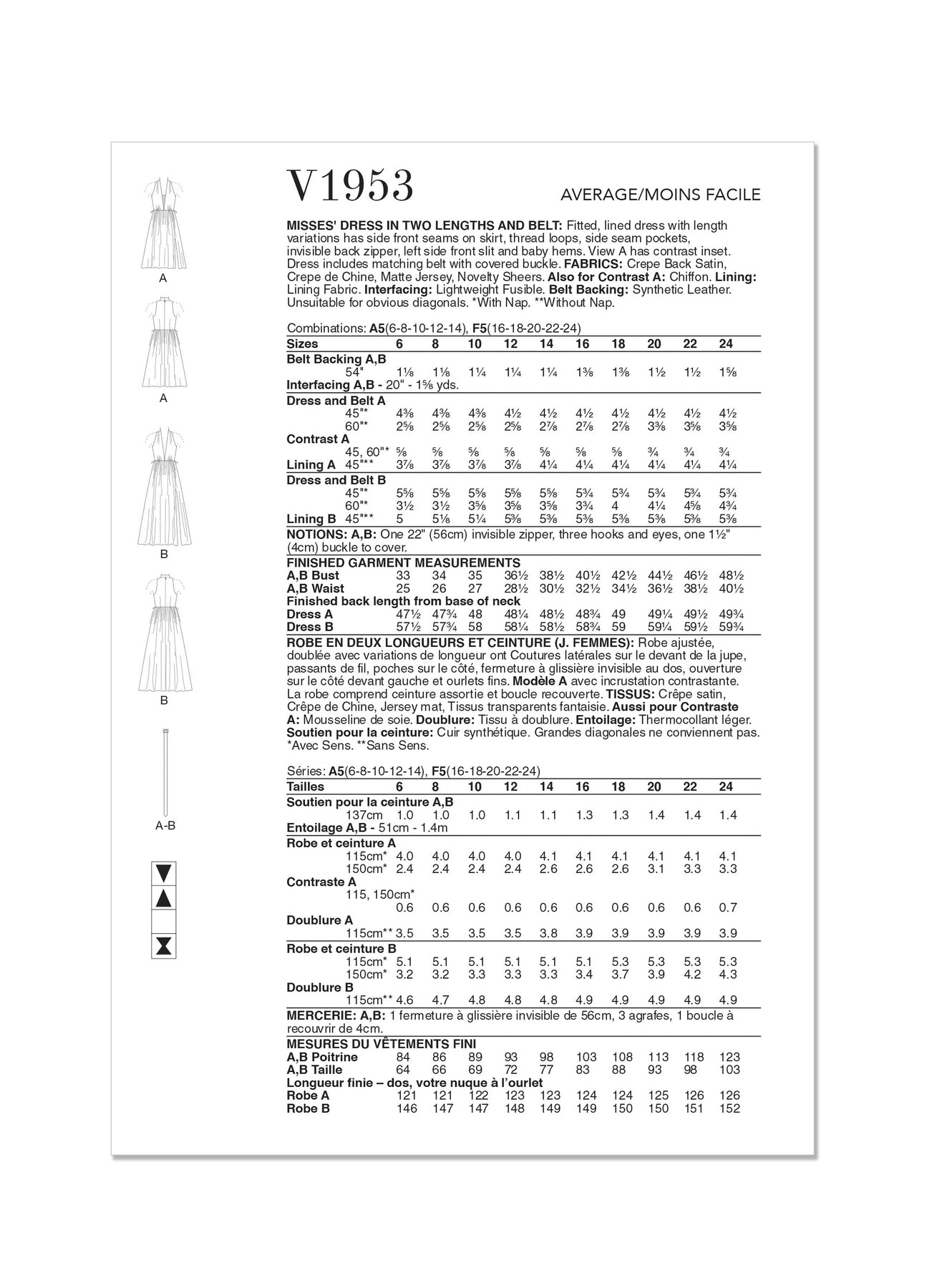 Crepe Back Satin, Crepe de Chine, Matte Jersey, Novelty Sheers. Auch für Contrast A: Chiffon. Innenfutter: Futterstoff. Einlage: Leichtes Fixiermaterial. Gürtel-Unterlage: Synthetisches Leder. Nicht geeignet für offensichtliche Diagonalen.