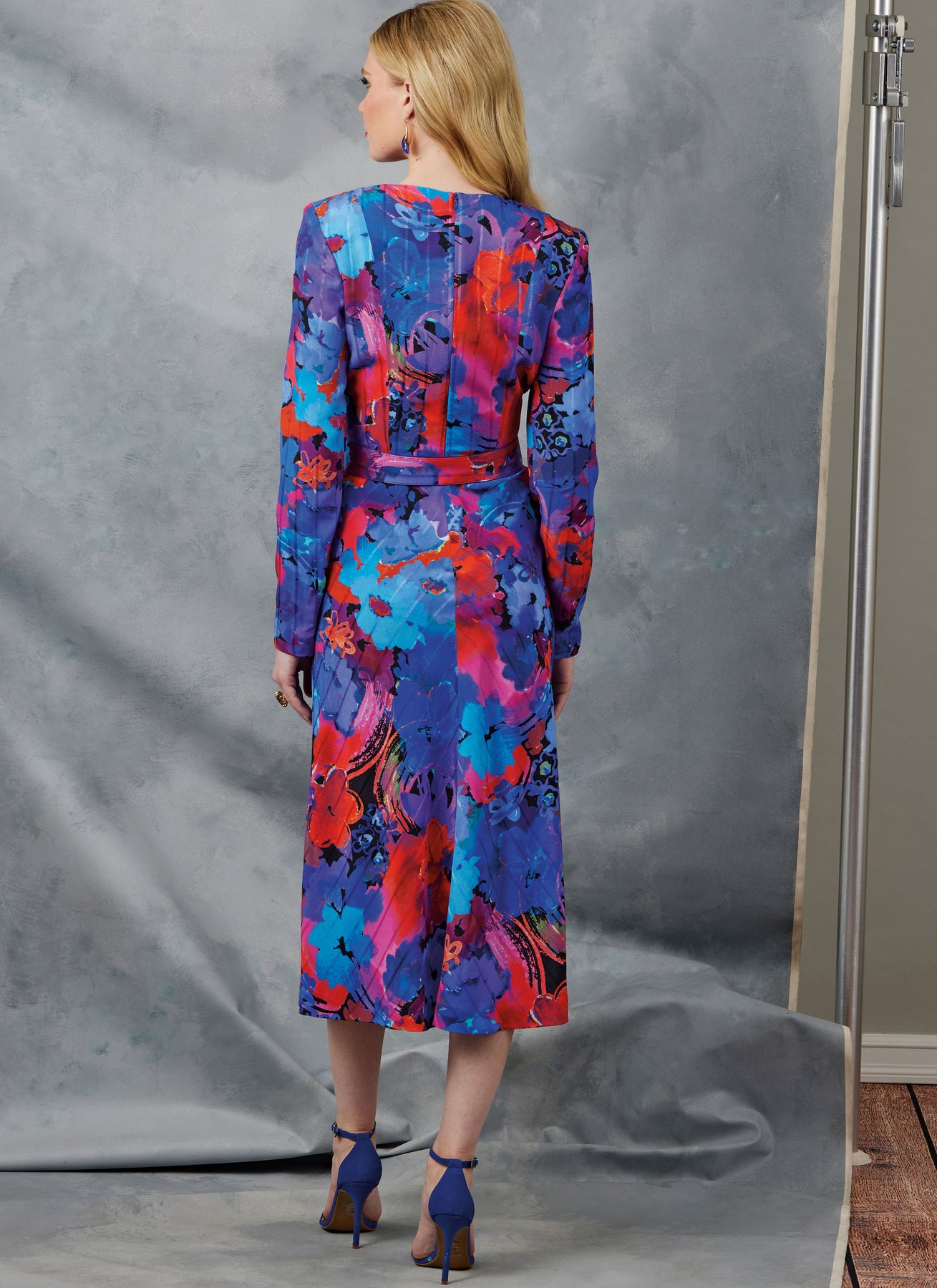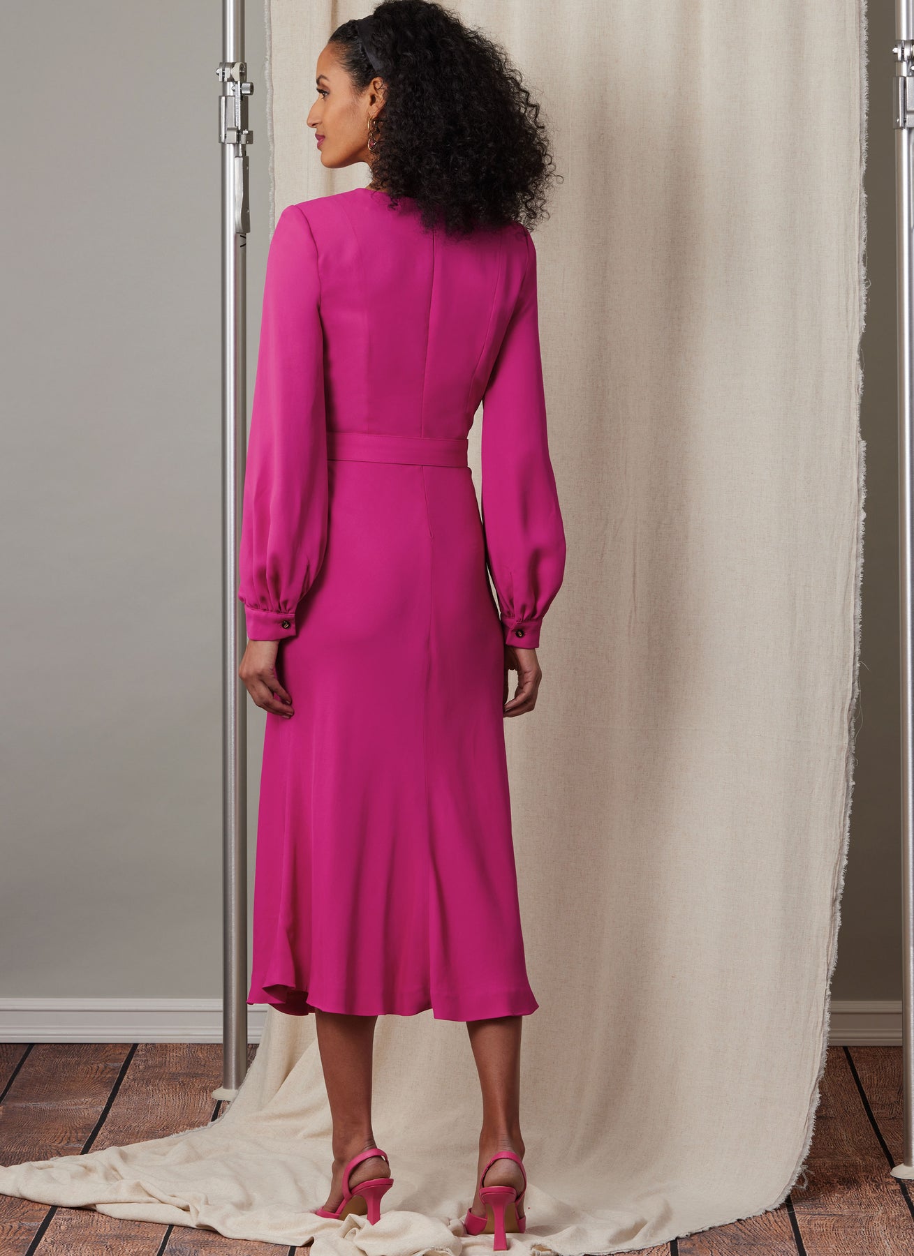 Ungefüttertes Kleid, im Brustbereich eng anliegend, mit Schulterpolstern, asymmetrischer, an Schulter und Seitennaht geraffter Frontdrapierung (Schrägschnitt), Mieder mit Prinzessinnennähten, schräg geschnittenem Rock, passendem Gürtel mit verdeckter Schnalle und Fadenschlaufen. Ansicht A hat lange, spitz zulaufende Ärmel mit Ellbogenabnähern und unsichtbarer Reißverschlussöffnung. Ansicht B hat Läuferärmel mit geknöpften Manschetten und Schoßöffnung.