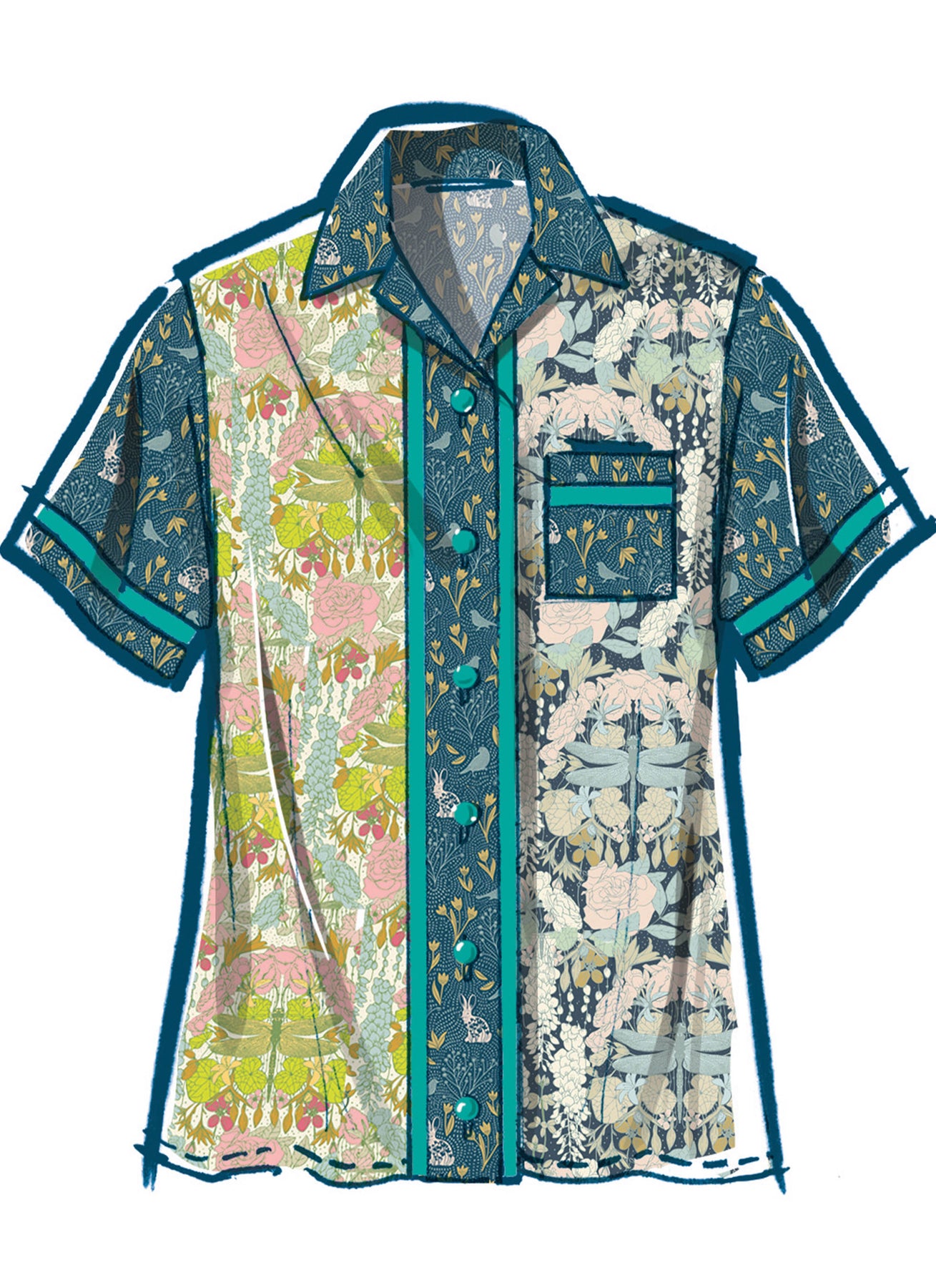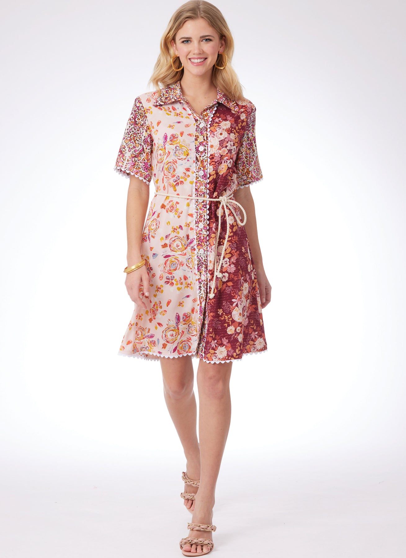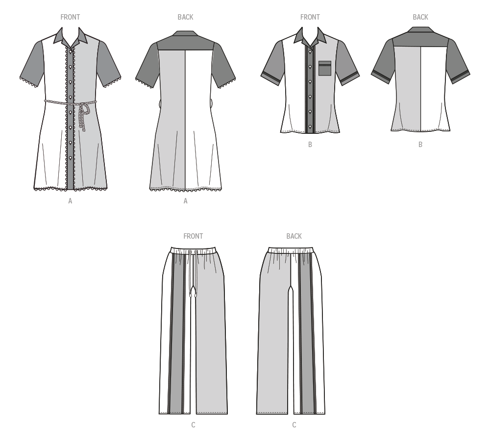 Hemdkleid und Oberteil haben kurze Ärmel, Kragen, Knopföffnung vorne, Rückenpasse und Kontrast. Hemdkleid in Ansicht A hat einen Bindegürtel und Ripsbandbesatz an Ärmeln, Knopfleiste und Saum. Das Oberteil in Ansicht B hat eine Brusttasche auf der Vorderseite sowie Zierleisten an Ärmeln, Knopfleiste und Tasche. Die Hose zum Anziehen hat einen Kontrast, einen Gummizug und einen Kordelzug am Bund und schmalen Saum.