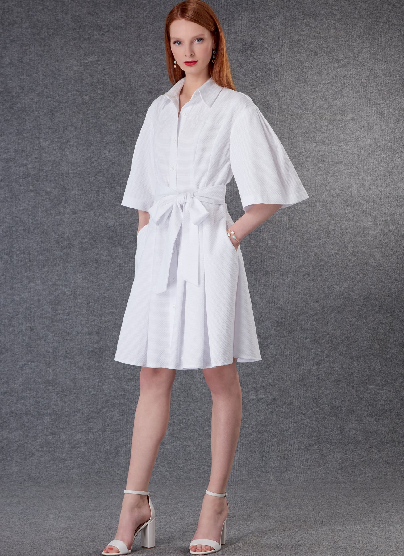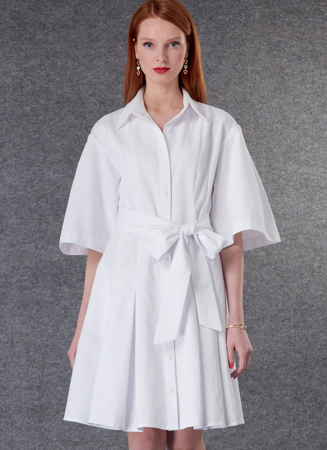 Dieses Damenkleid mit Knopfleiste und Gürtel ist im Brustbereich tailliert und verfügt über einen Kragen mit Kragenband, überschnittene Schultern sowie Glockenärmel. Die Prinzessnähte enden in Falten, und praktische Seitennahttaschen ergänzen das Design. Erhältlich in verschiedenen Längenvarianten – kurz oder lang – bietet es einen stylischen Look für jede Gelegenheit.