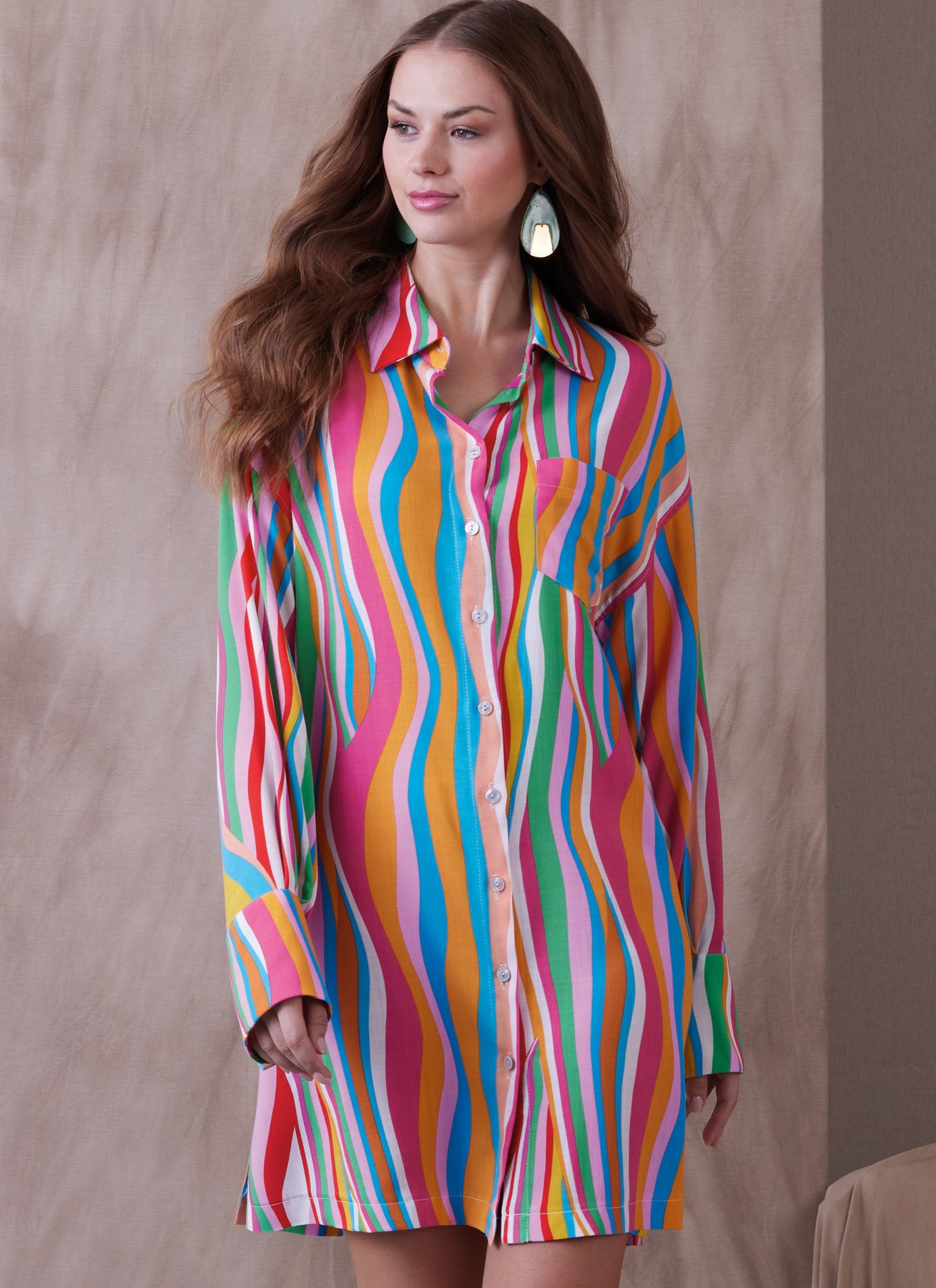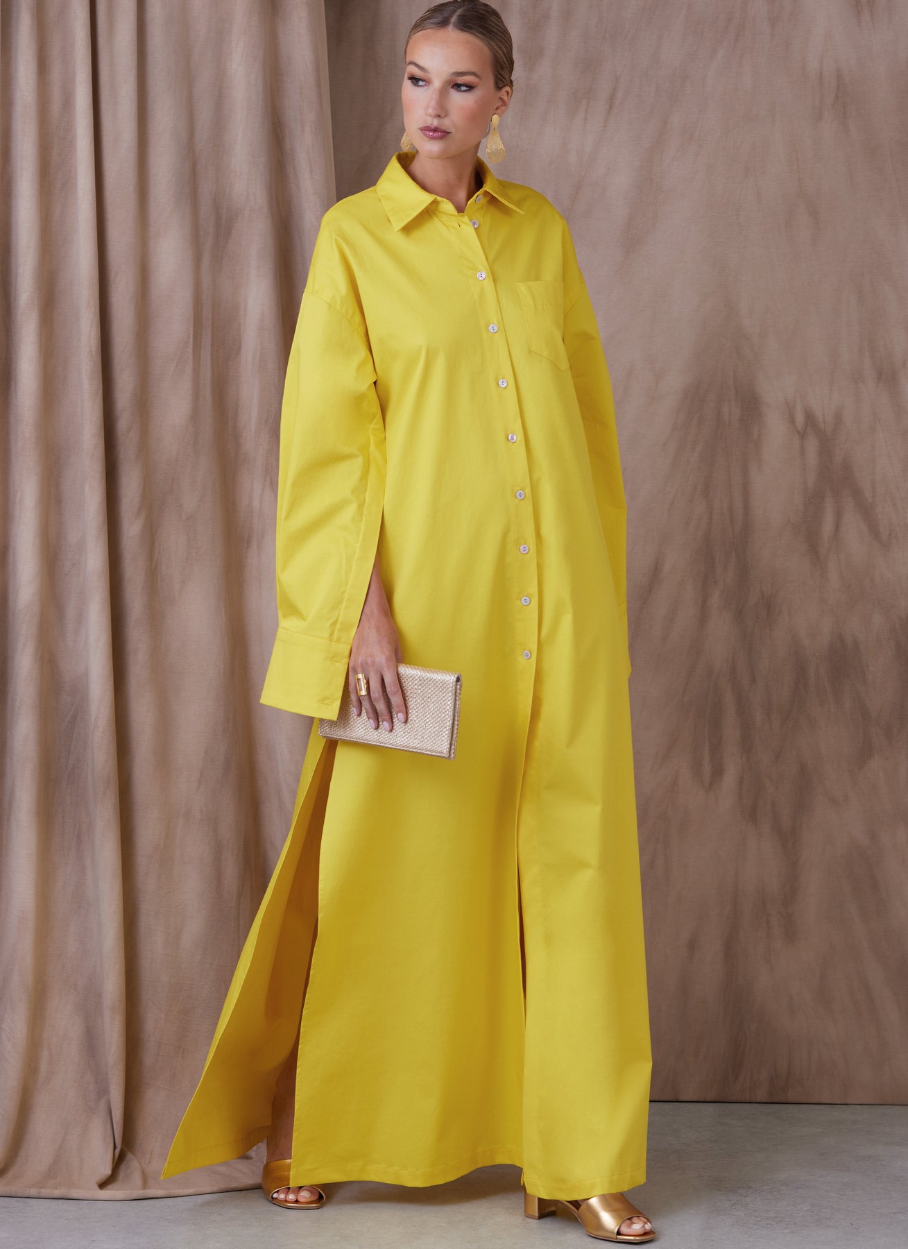 Das Kleid in A-Linie mit Knopfleiste ist im Brustbereich locker geschnitten und hat überschnittene Schultern, Kragen, Nackenband, aufgesetzte Taschen, Seitenschlitze und Längenvariationen. Lange Ärmel mit verdecktem Knopfverschluss entlang der unteren Naht und Knopfmanschetten.