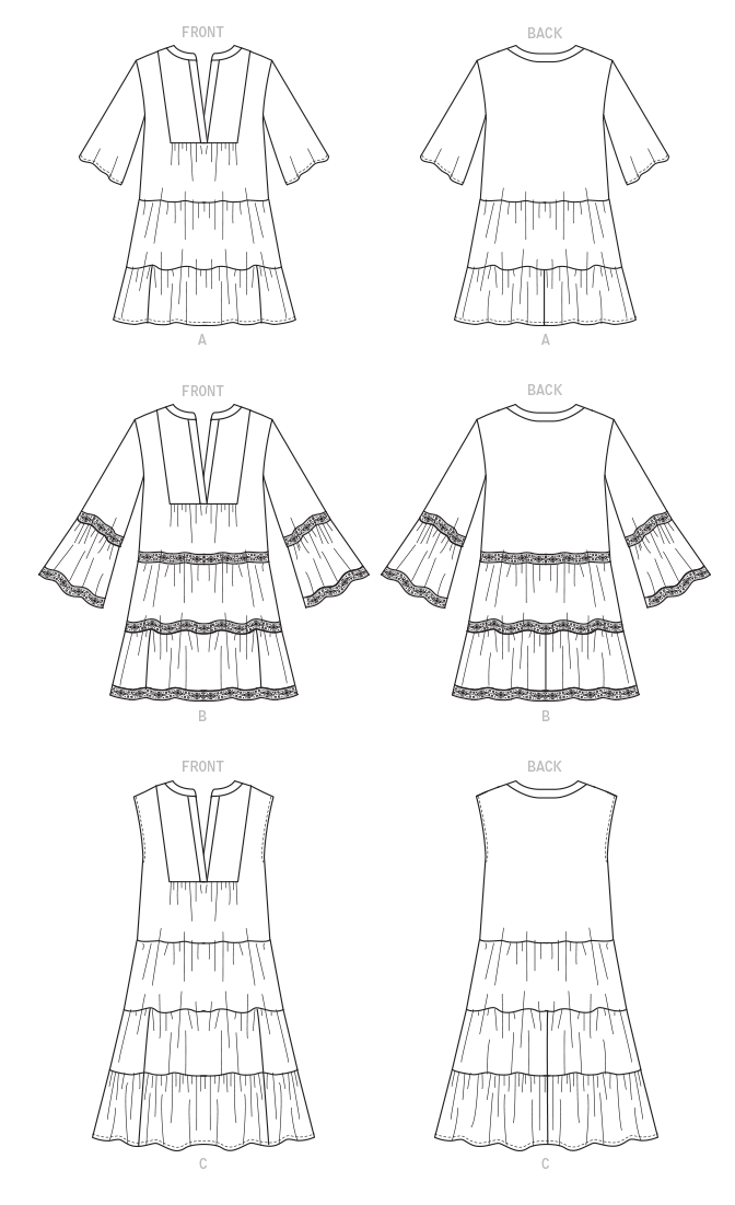 Locker sitzendes Kleid für Damen mit Rockschößen und Ärmelvarianten. B: Spitzenbesatz.