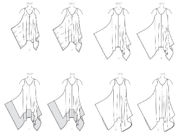 Pulloverkleider und Jumpsuits zum Anziehen haben drapierte Seiten und einen schmalen Saum. A: gefüttert. C: untere Bänder. D: weite Beinausschnitte.