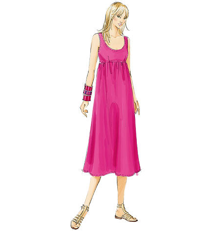 Im Sommer schnell drübergezogen. Kleider mit Empire-Taille haben einen gesäumten Halsausschnitt, Seitennahttaschen und einen elastischen Bund in der Taille. A, C, D: Ärmellos. A: Mieder und Saumband in Kontrastfarbe. B: Ärmel gerafft bis zum Ärmelbund.