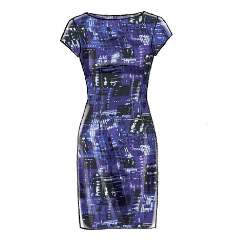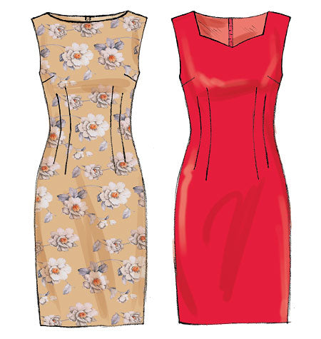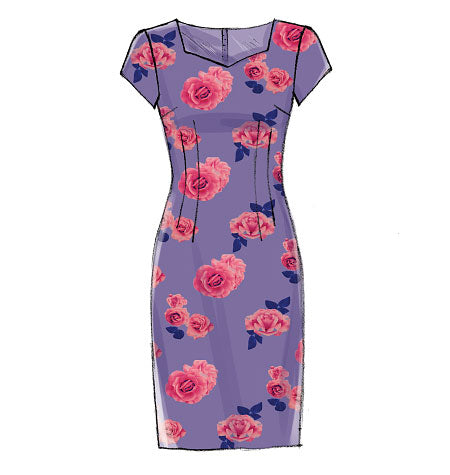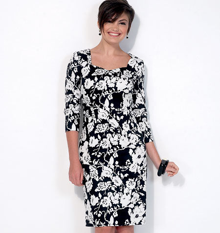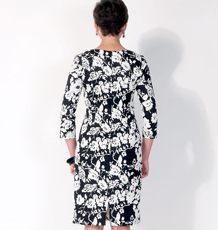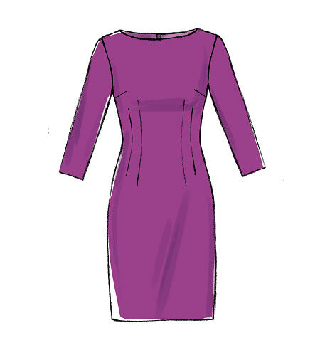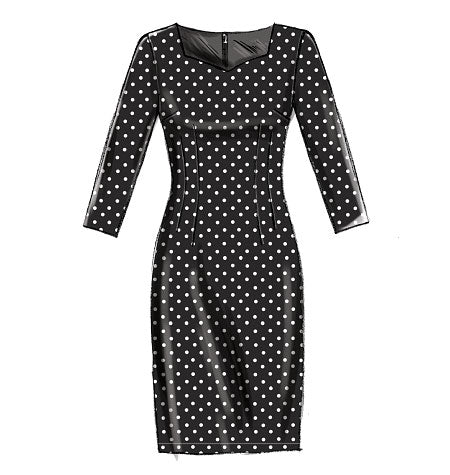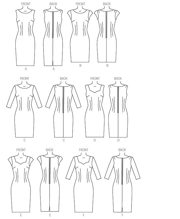 Halb taillierte, gefütterte Kleider (im Brustbereich tailliert) mit Ausschnittvariationen und Rückenreißverschluss. B, E: Selbstgefütterte Ärmel. A, E, F: Rückenschlitz. C, F: Ungefütterte Ärmel. Entworfen für mittelschwere Webstoffe.