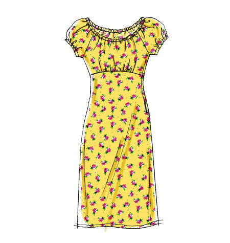 KLEIDER FÜR DAMEN: Pulloverkleider haben geraffte Miedervarianten, eine erhöhte Taille, einen halb taillierten, schrägen Rock, einen schmalen Saum und einen seitlichen Reißverschluss. A: Schulterträger. A, B: Locker sitzendes Mieder, Ausschnitt und Teilärmel B: Mit Gummizug. C: Overlay und Rüschen. D: Falte und Knopfleiste an den Ärmeln. A, C, D: Vorgeformte Blenden. C, D: Tailliertes Mieder. Entworfen für leichte bis mittelschwere Webstoffe.