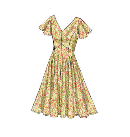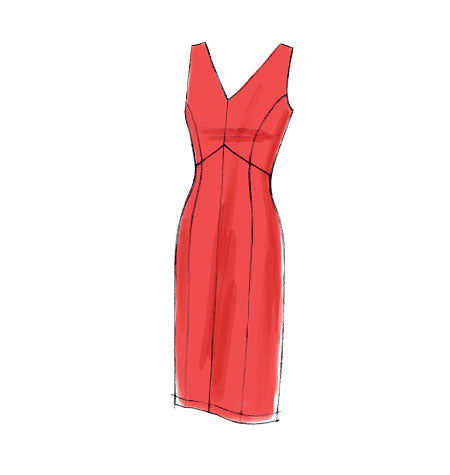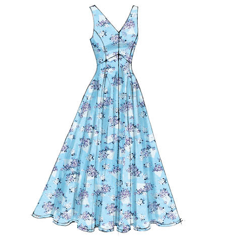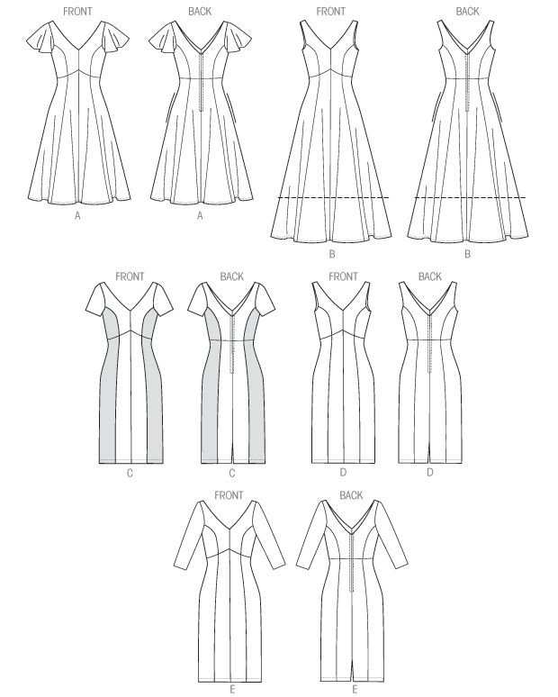 Gefüttertes Kleid mit Prinzessnähten, eng anliegendem Mieder, erhöhter Taille, abgesteppten Säumen, Reißverschluss hinten und ungefütterten Ärmelvarianten. A: Ärmel und schmaler Saum. B und C: ärmellos. A, B, C: ausgestellter Rock. D, E, F: halb ausgestellter Rock und Rückenschlitz.