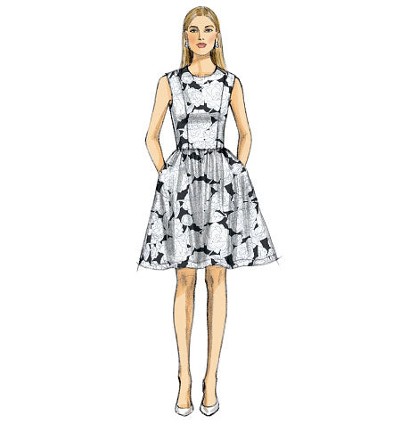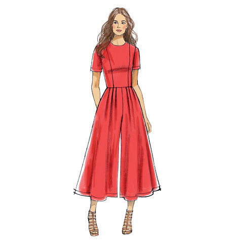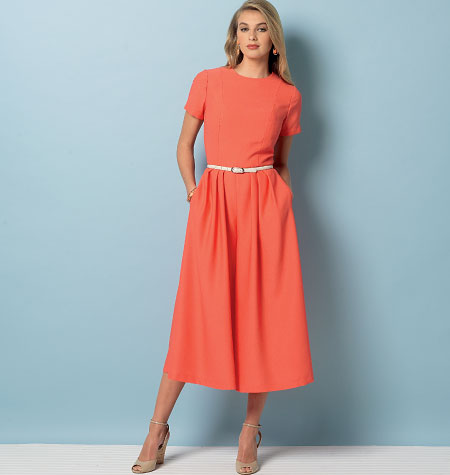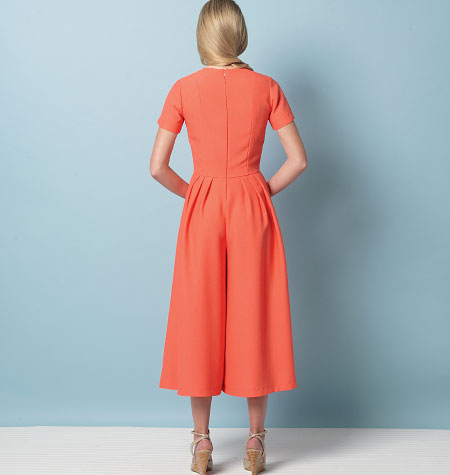 Kleid oder Jumpsuit mit eng anliegendem, gefüttertem Oberteil mit Prinzessnähten, Seitentaschen, abgestepptem Saum und Reißverschluss hinten. B: Hose mit weitem Bein und Falten. STOFFE: Leichter Denim, Krepp, Jersey, Leinenmischungen. Nicht geeignet für offensichtliche Diagonalen. *Mit Flor. **Ohne Flor.
