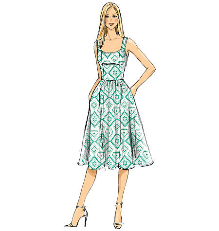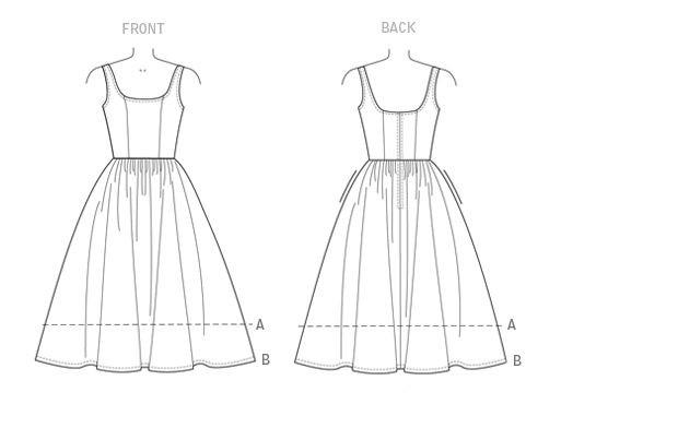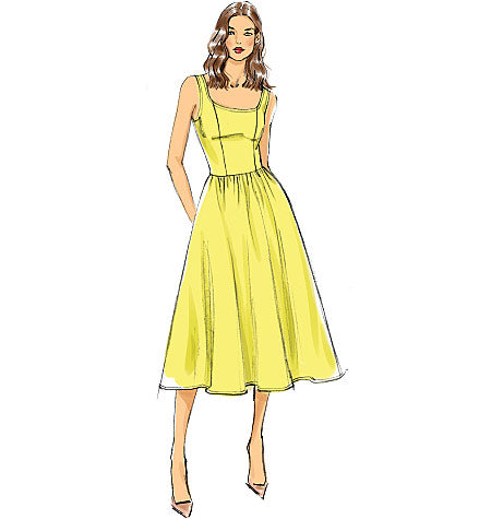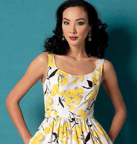 Das Kleid hat ein eng anliegendes, gefüttertes Oberteil mit Prinzessnähten, Seitentaschen, schmalem Saum und Reißverschluss hinten. Abgesteppt. Hinweis: Für die Körbchengrößen A, B, C und D sind separate Schnittmusterteile enthalten.