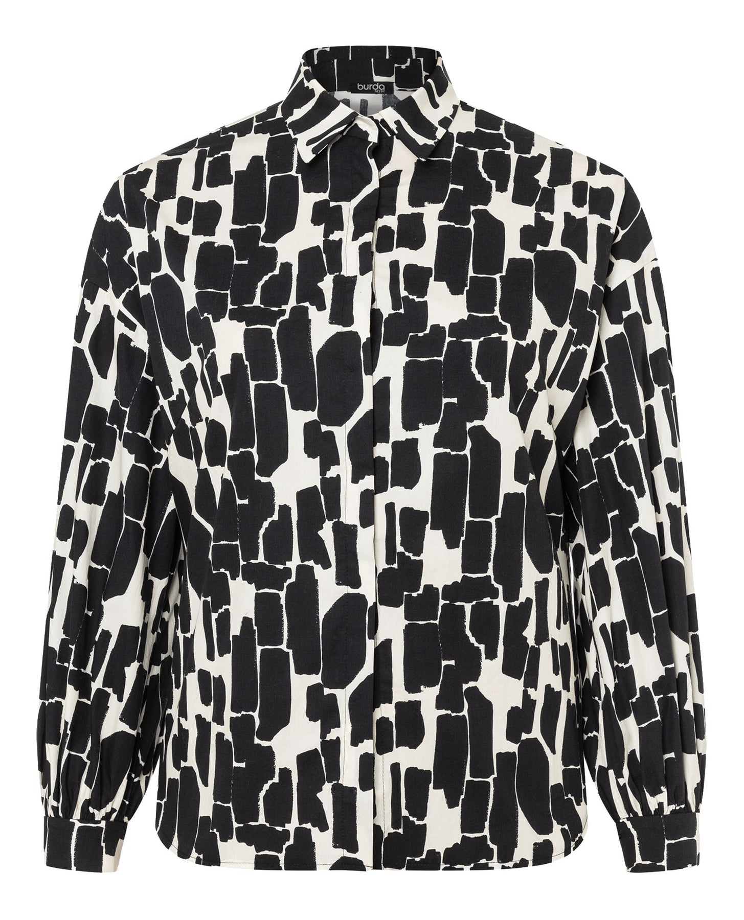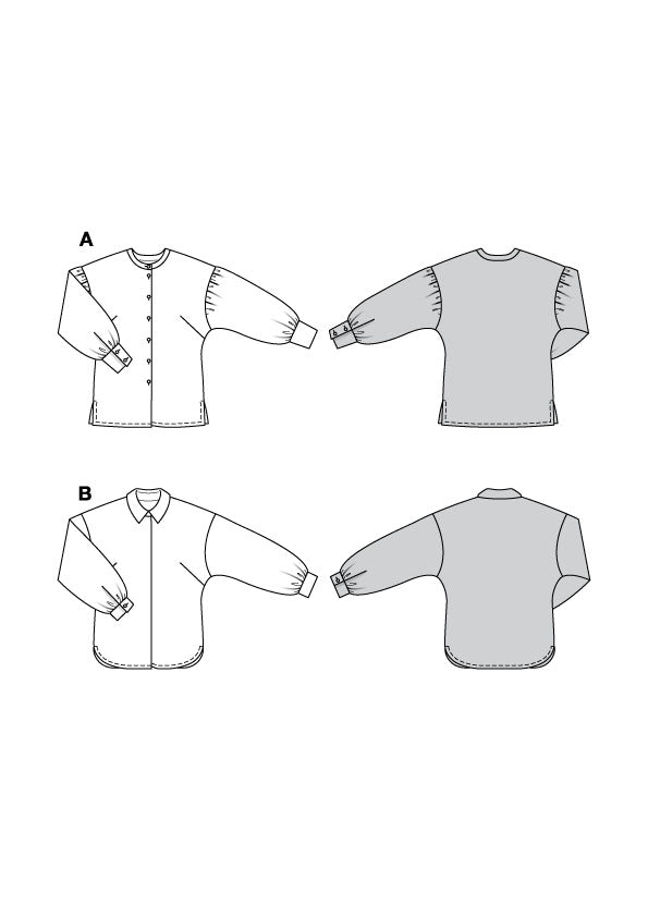 Mit diesem Schnittmuster nähst du gleich zwei Blusen! Ein dramatischer Fall durch tief eingesetzte und gekräuselte Ärmel verleiht der Bluse Eleganz. Die Ärmel mit kleinem Hemdkragen sorgen für Fashion-Momente. Die verdeckte Knopfleiste lenkt nicht vom Print ab. Stoffempfehlung: Baumwollstoffe, Viskose und Seide.
