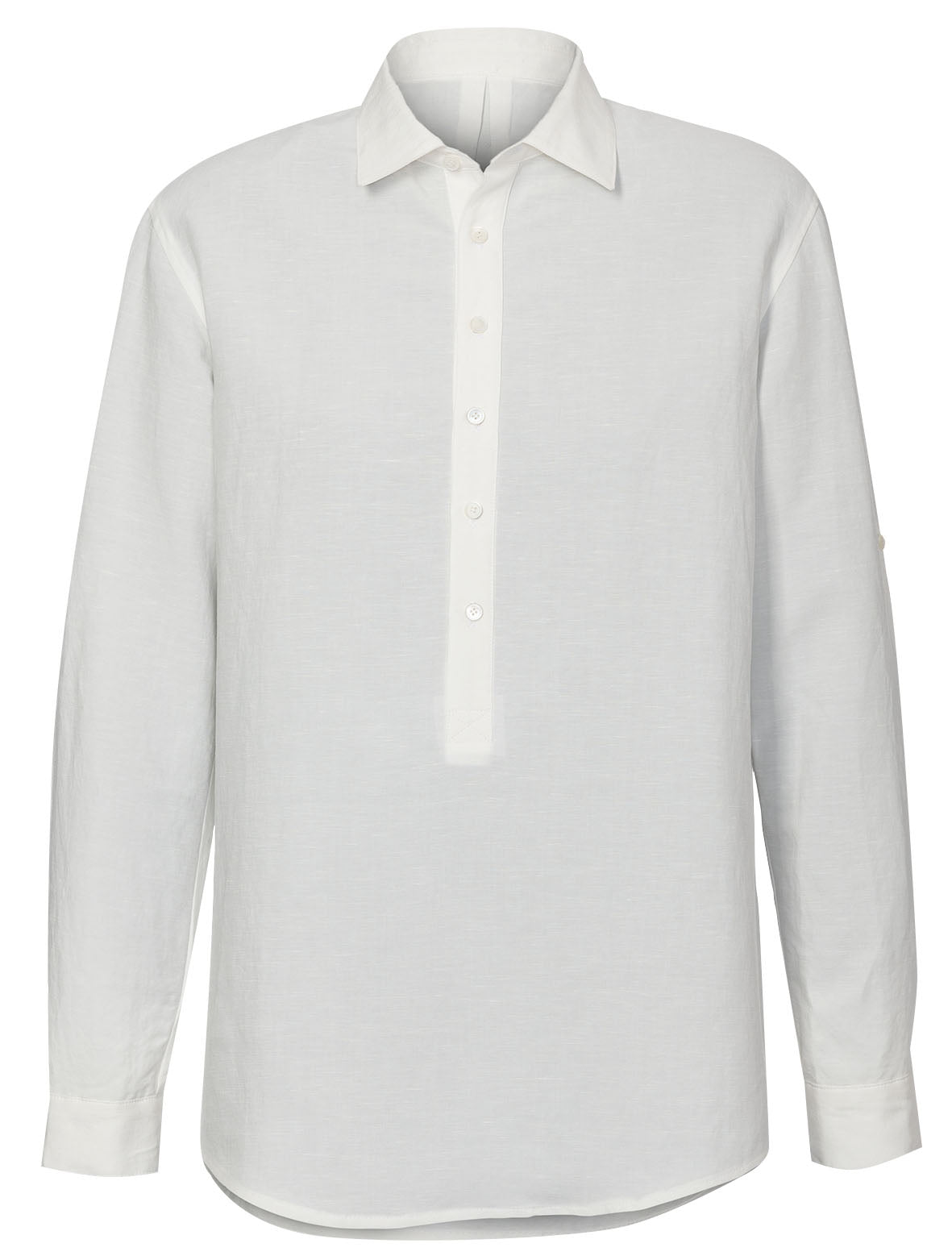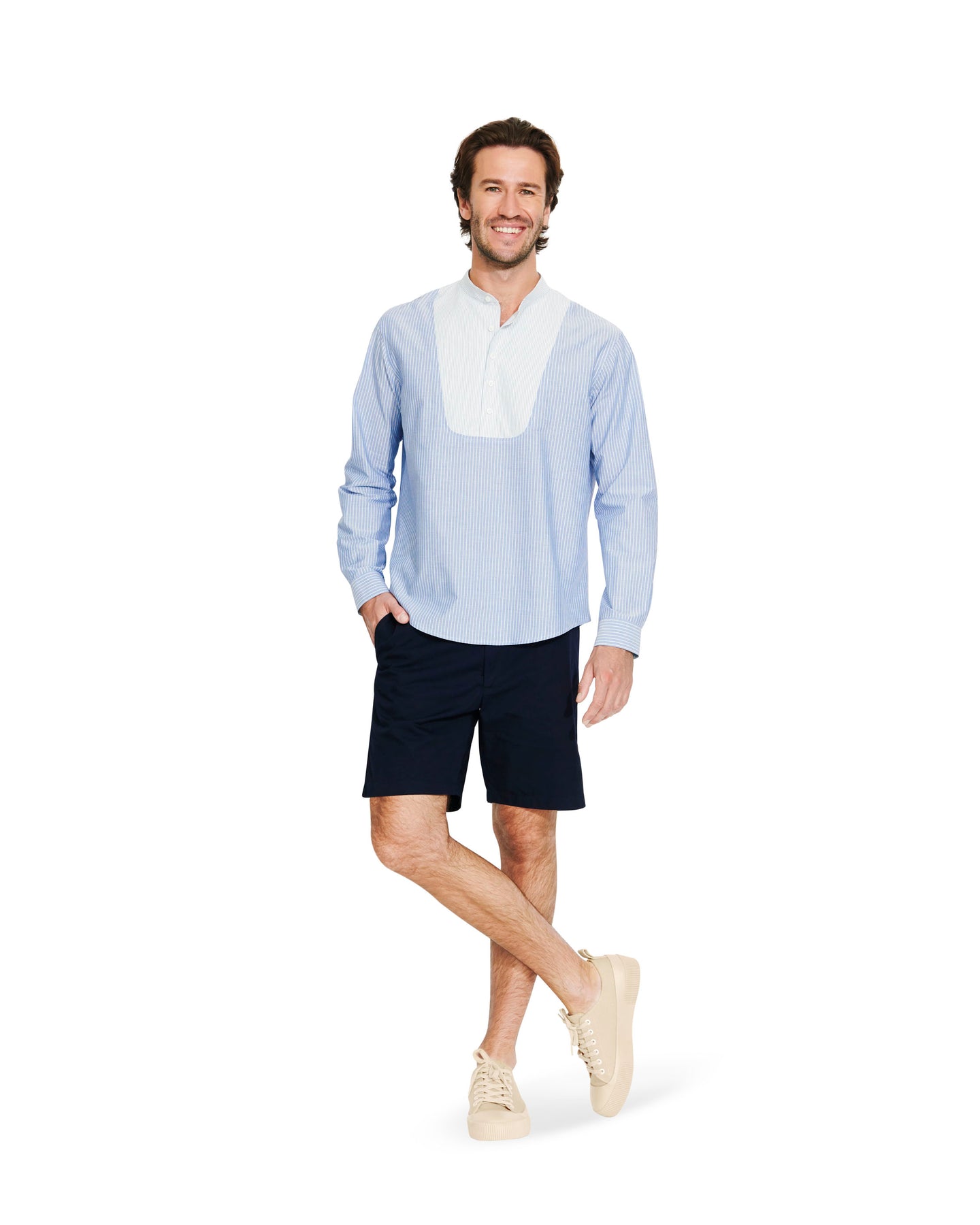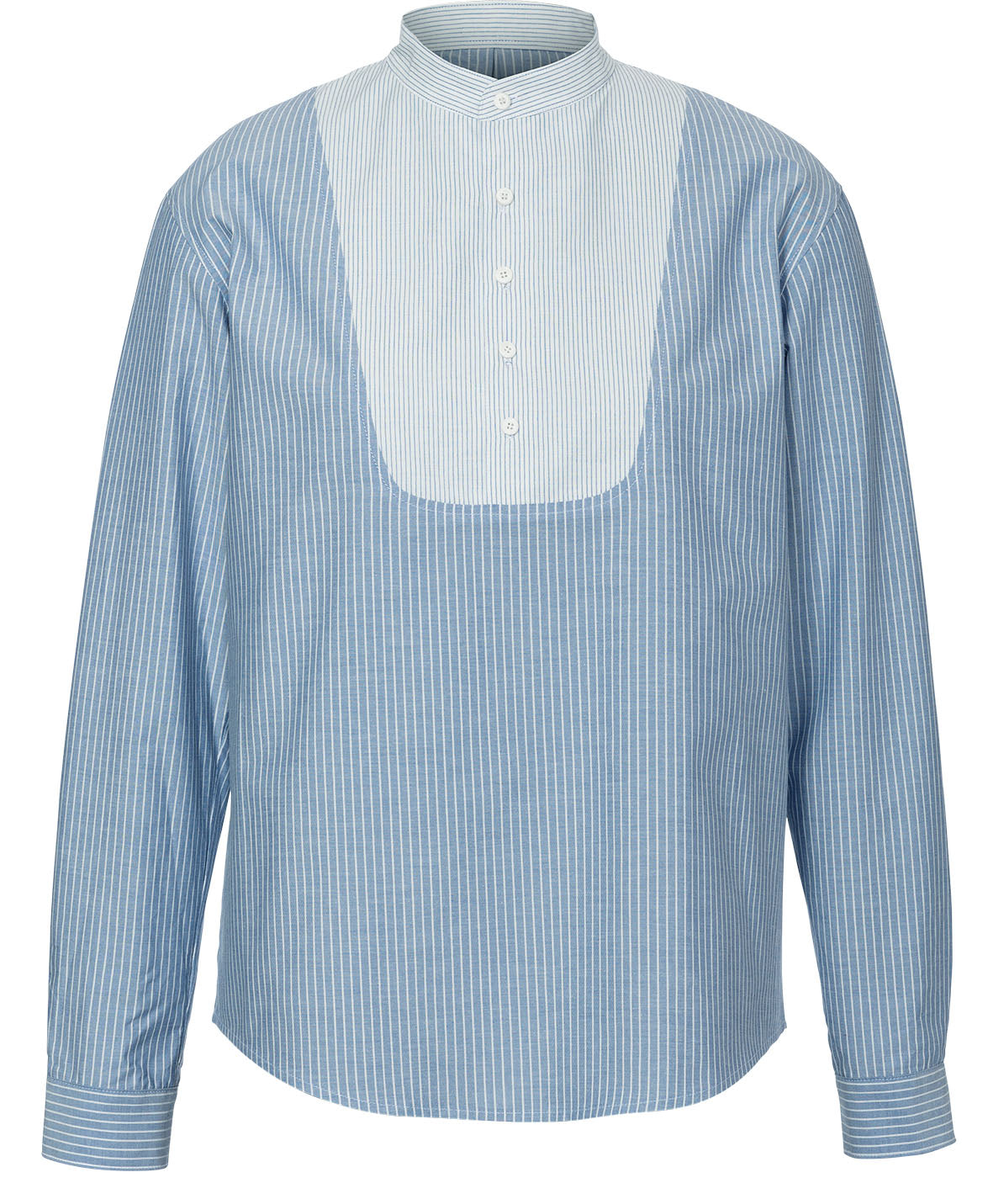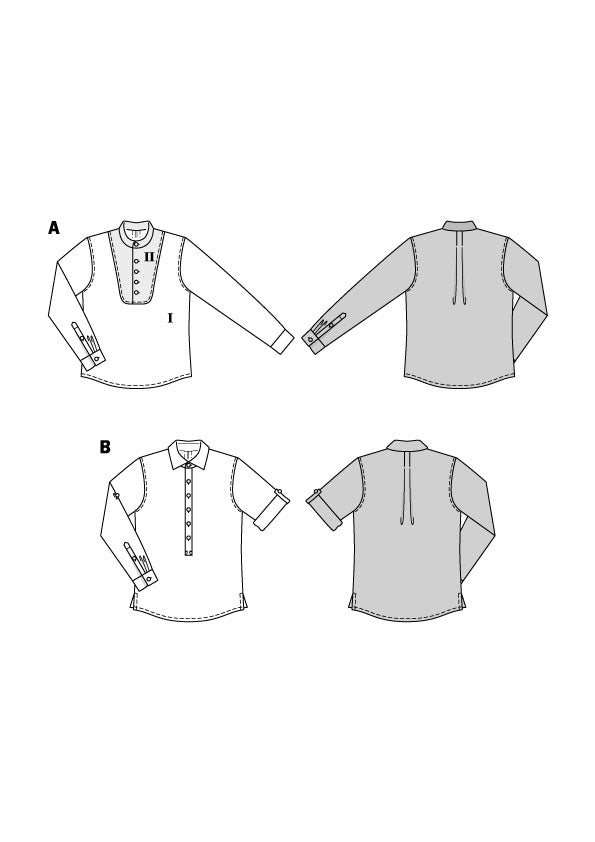 Bequeme Schlupfhemden für ihn. A mit Plastron und Stehkragen, B mit Poloblende und klassischem Kragen mit Steg. Die aufwändigen Ärmelschlitze sind bei beiden Varianten ein schönes Detail.