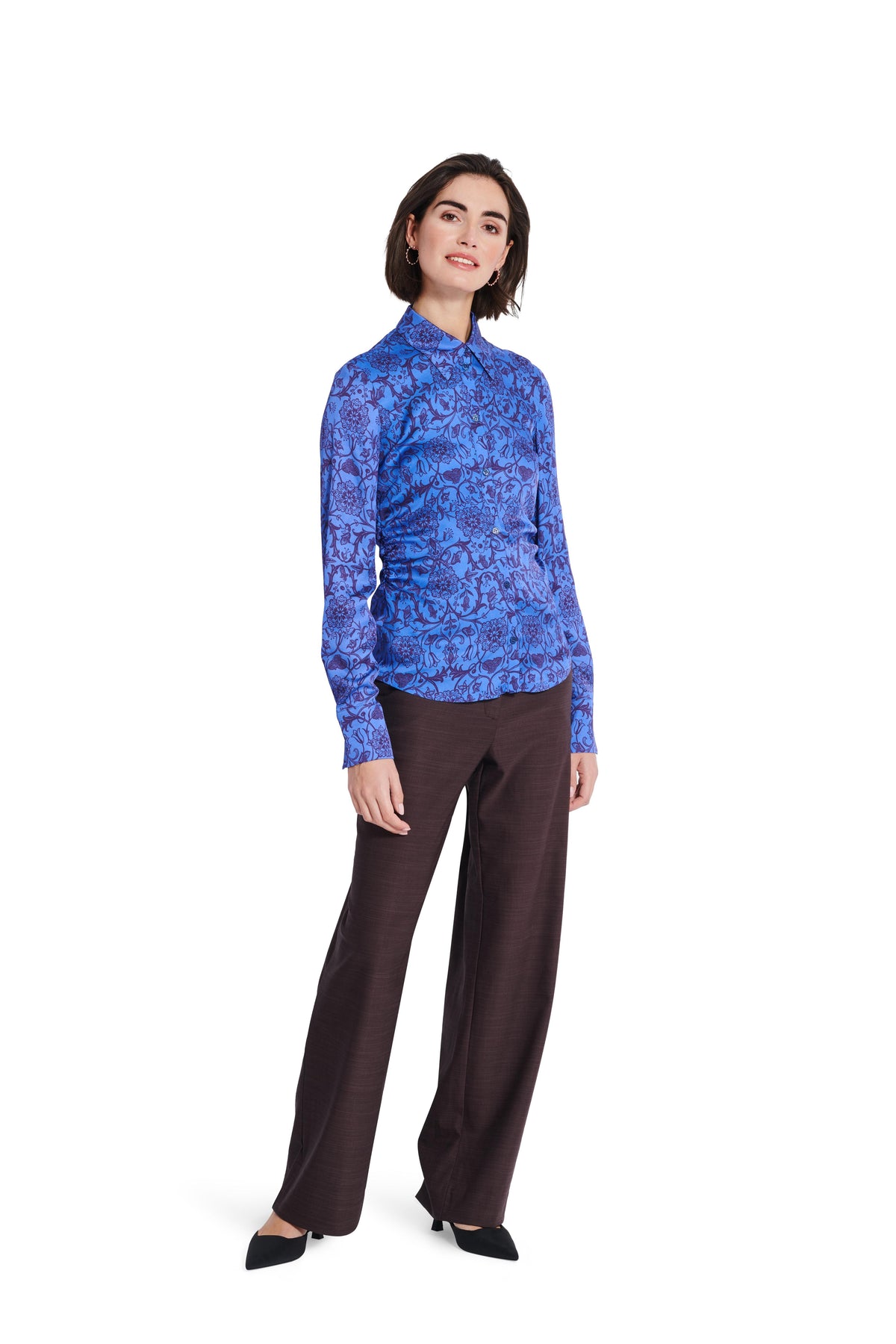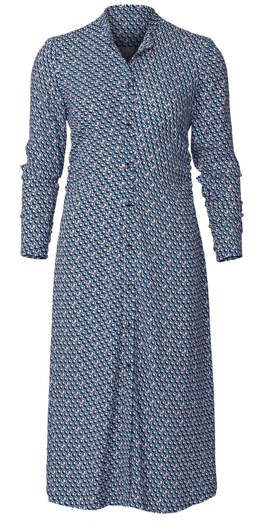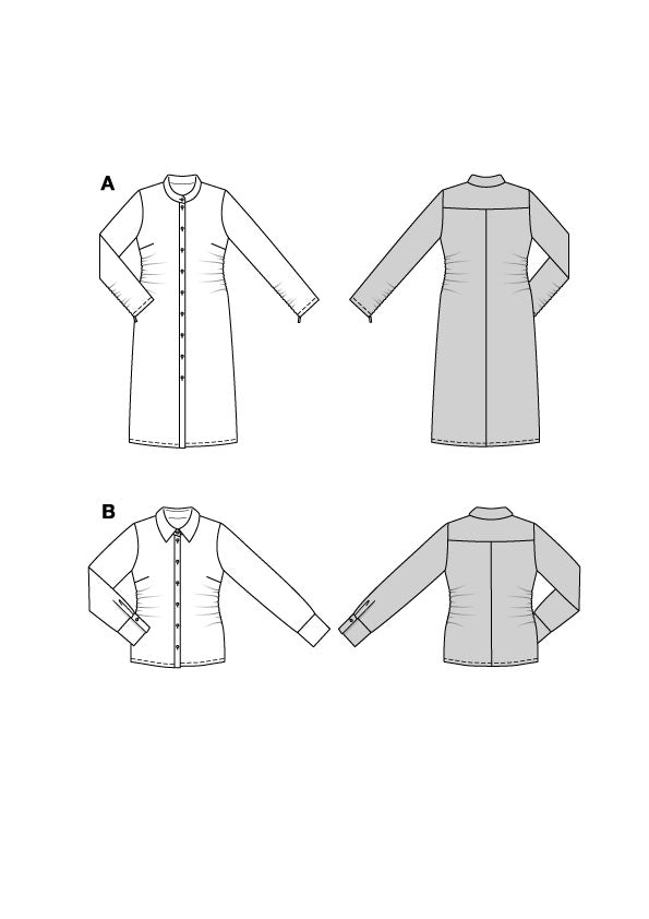 Bluse oder Hemdblusenkleid, in körpernaher Schnittführung mit Raffung in den Seitennähten und kleinem Stehkragen oder klassischem Kragen mit Steg. Bei Kleid A werden auch die schmalen Ärmel an den Schlitzen mit Reißverschluss gerafft.