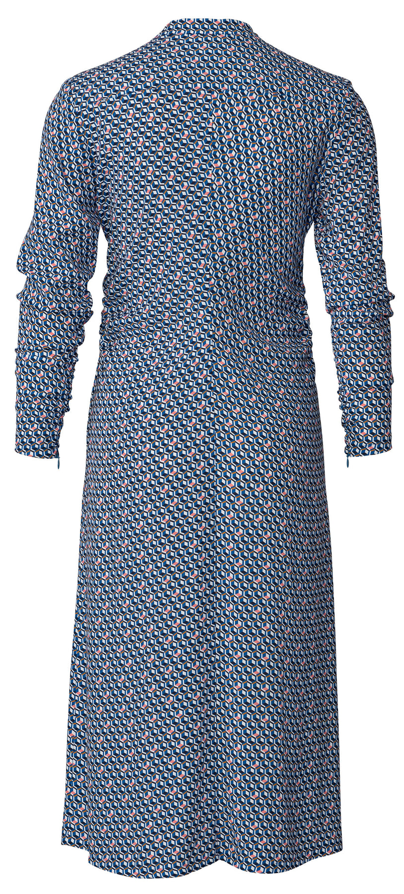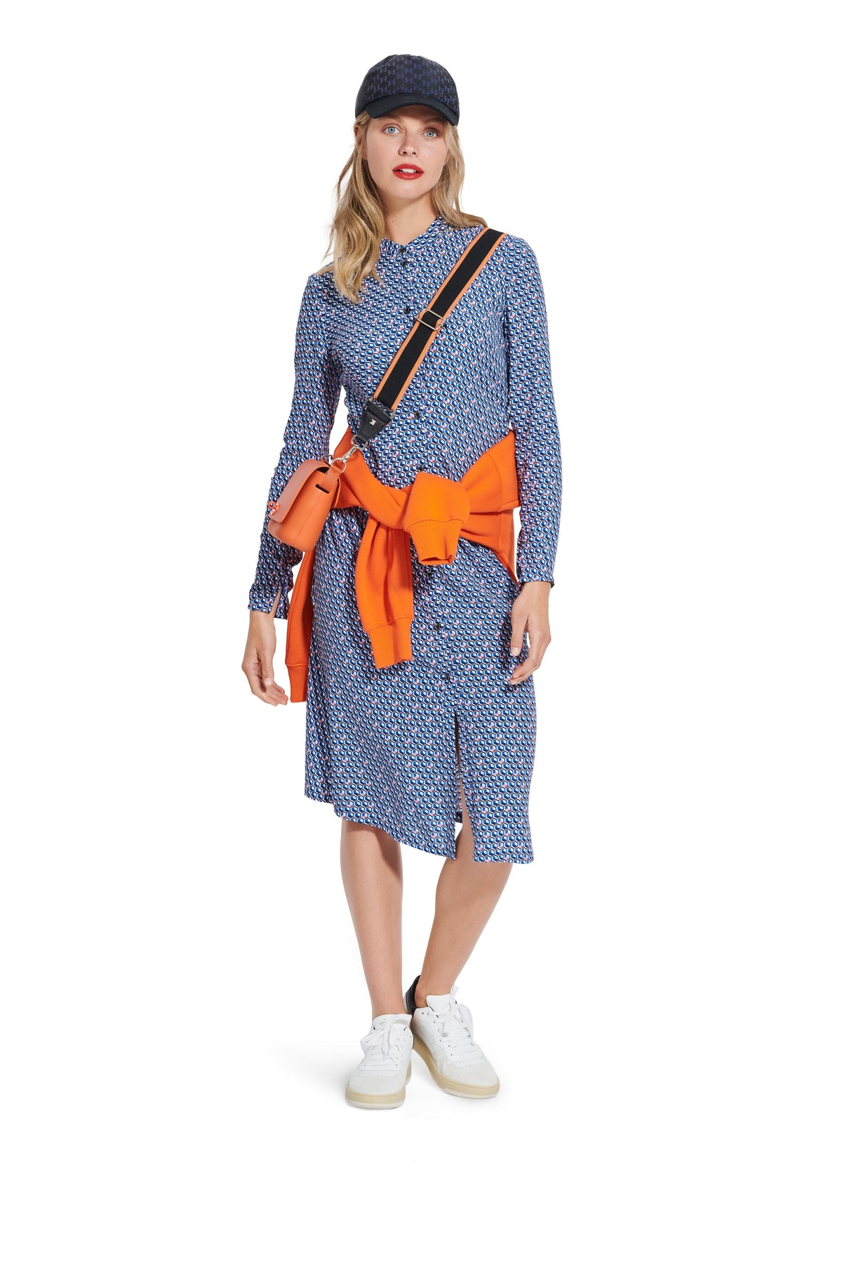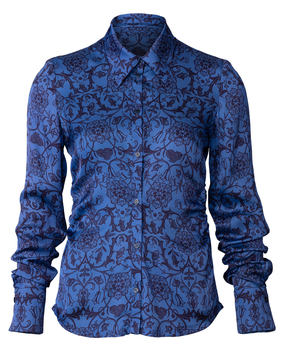 Bluse oder Hemdblusenkleid, in körpernaher Schnittführung mit Raffung in den Seitennähten und kleinem Stehkragen oder klassischem Kragen mit Steg. Bei Kleid A werden auch die schmalen Ärmel an den Schlitzen mit Reißverschluss gerafft.