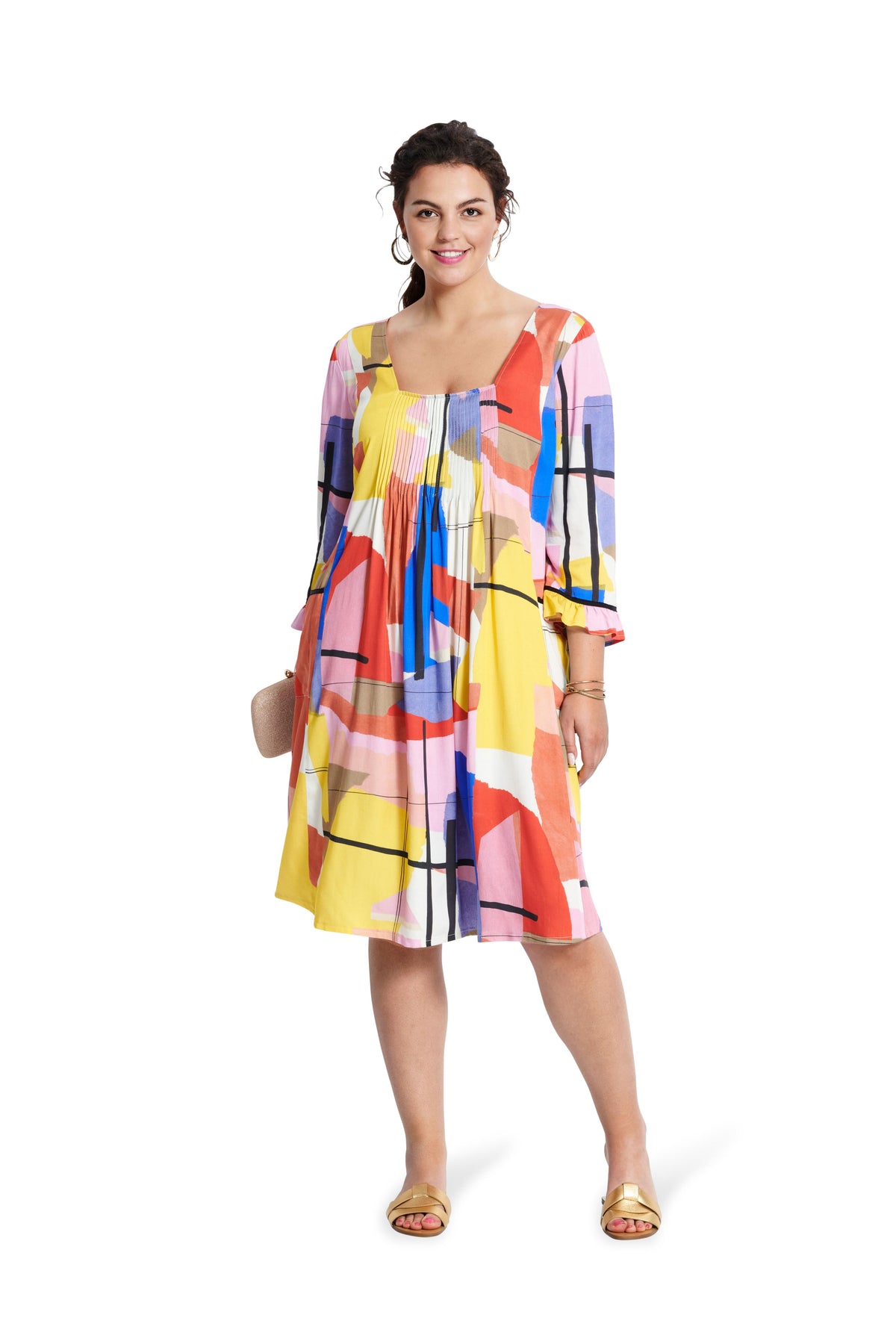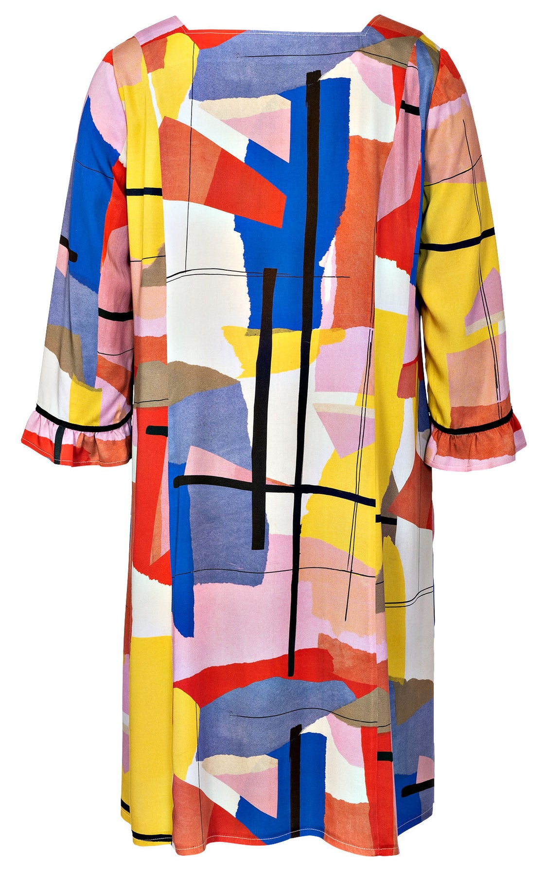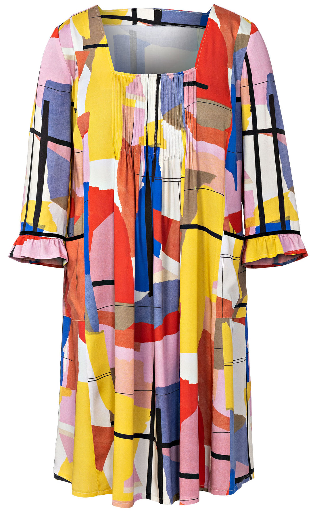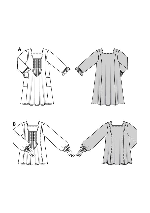 Einfach zum Reinschlüpfen sind Bluse und Kleid mit eckigem Ausschnitt und hübschen Fältchen am Vorderteil die bequeme Weite bringen. Kleid A mit Taschen und Rüsche an den verkürzten Ärmeln. Tunika B hat lange Ärmel, die mit einem Ärmelbündchen und Bindebändern abschließen.