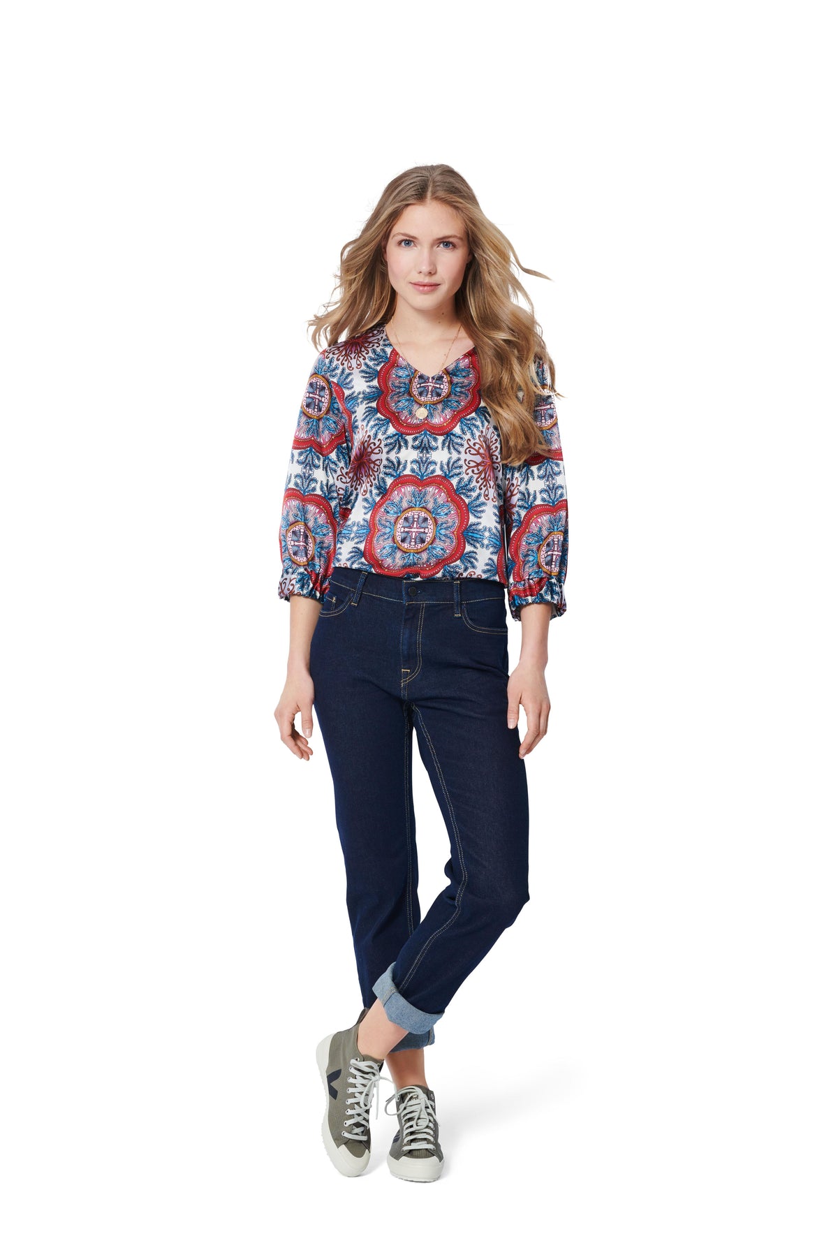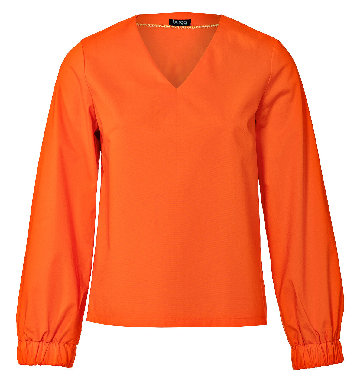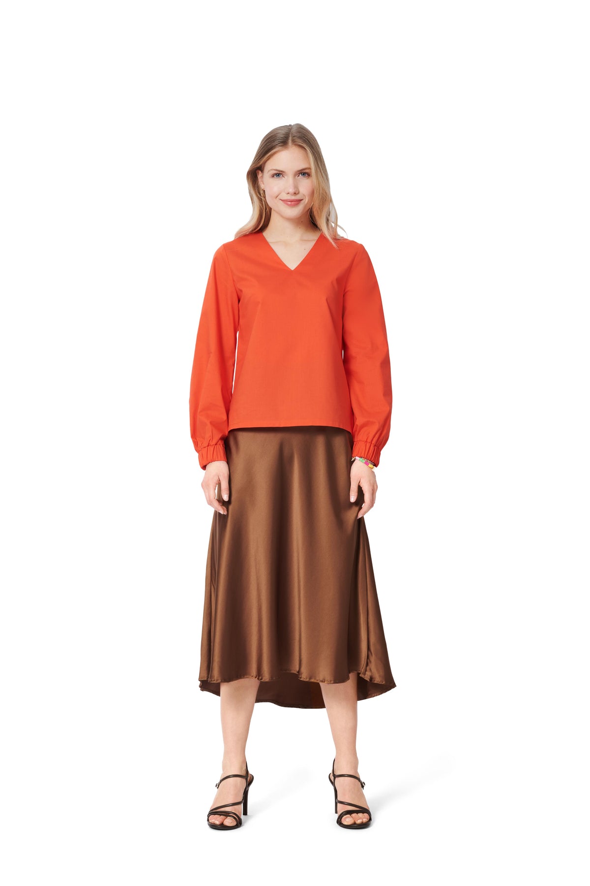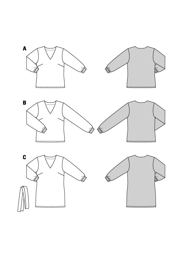 Verschlusslose Blusen mit V-Ausschnitt in zwei verschiedenen Längen. Schnell und einfach zu nähen. Die Ärmellänge variiert, der Abschluss bleibt mit einem Gummibandbündchen bei allen gleich. Die hüftlange Bluse C hat zusätzlich einen Bindegürtel aus demselben Stoff.