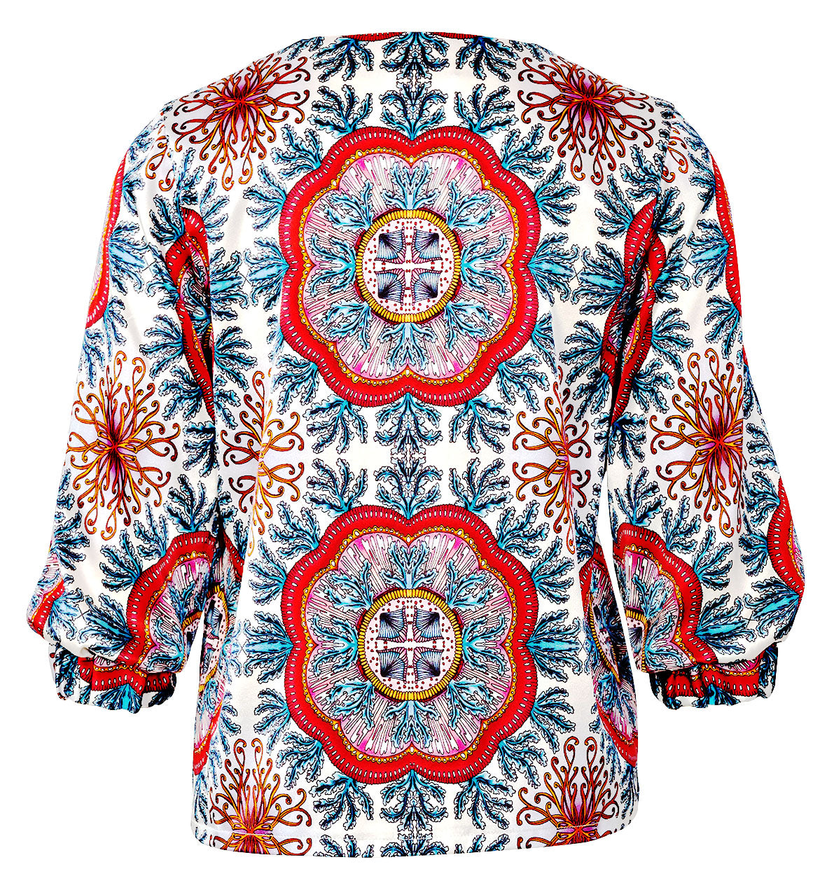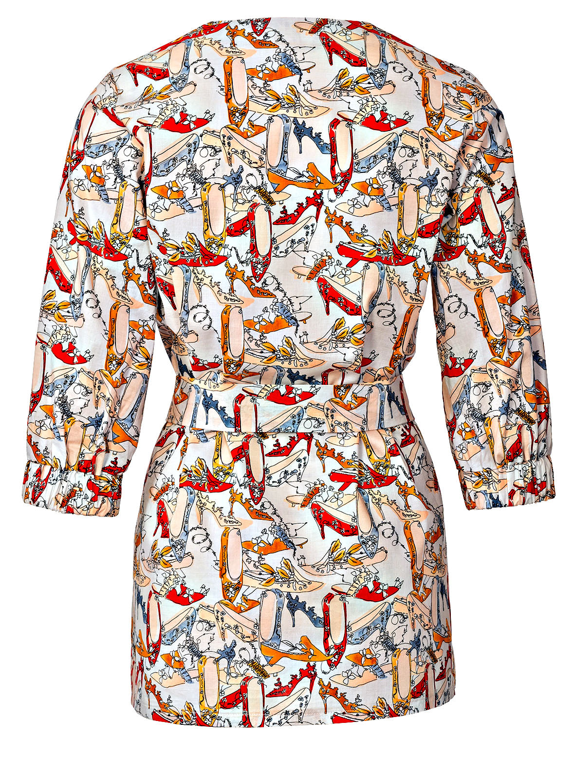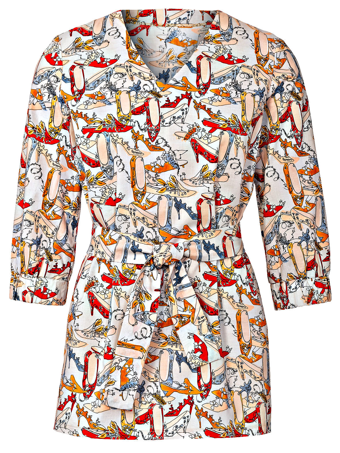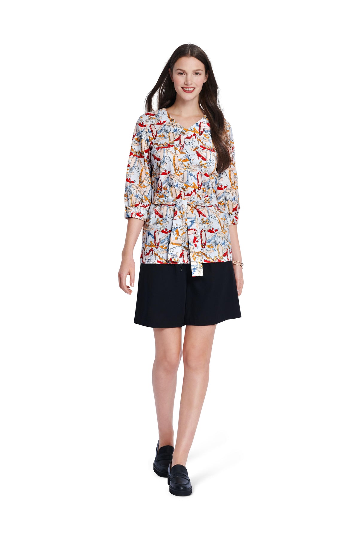 Verschlusslose Blusen mit V-Ausschnitt in zwei verschiedenen Längen. Schnell und einfach zu nähen. Die Ärmellänge variiert, der Abschluss bleibt mit einem Gummibandbündchen bei allen gleich. Die hüftlange Bluse C hat zusätzlich einen Bindegürtel aus demselben Stoff.