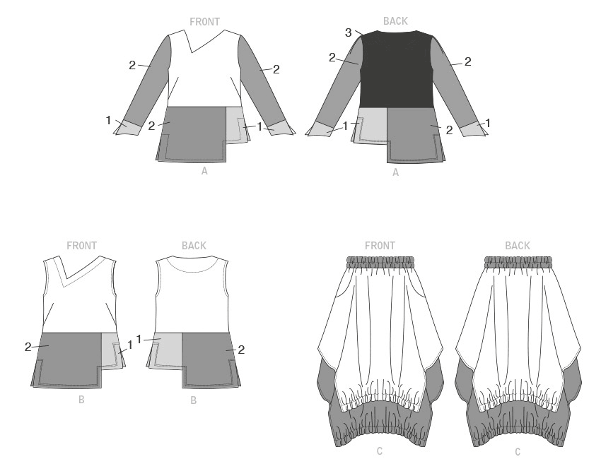 Stoffempfehlung:Nicht geeignet für offensichtliche Diagonalen. *Mit Flor. **Ohne Flor. Drapierte Gewebe oder Gestricke, Rayon Viskose, ITY Gestricke, Jersey. Hinweis: Die Stoffanforderungen erlauben Flor, einseitiges Design oder Schattierungen. Zusätzlicher Stoff kann erforderlich sein, um das Design anzupassen oder um Schrumpfung zu vermeiden.