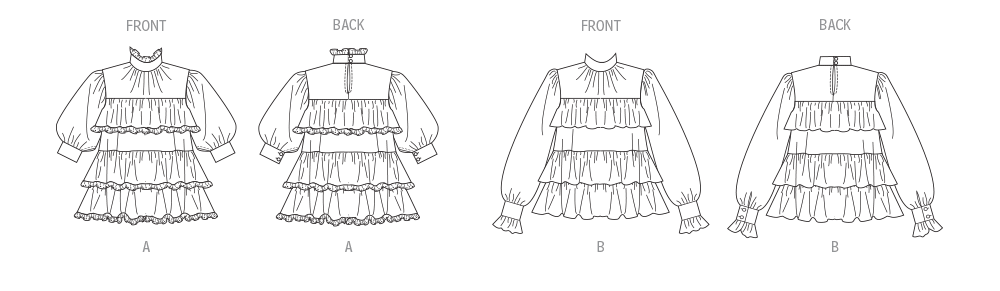 Locker sitzende, gerüschte Babypuppen-Oberteile haben einen gefütterten Körper, einen Stehkragen, Raffung am Hals, geraffte, angesetzte Ärmel mit Knopfmanschetten und einen Schlitz am Rücken. Der Kragen lässt sich mit Knöpfen und elastischen Schlaufen schließen.