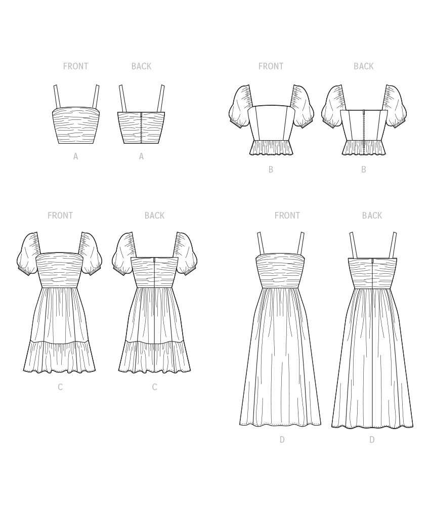 Oberteile mit quadratischem und rundem Halsausschnitt haben Abnäher für eine bessere Passform. Oberteile haben ärmellose, kurze Puffärmel und lange, elastische Ärmel. Oberteile haben seitliche unsichtbare Reißverschlüsse. Ansicht C hat einen Kragen.