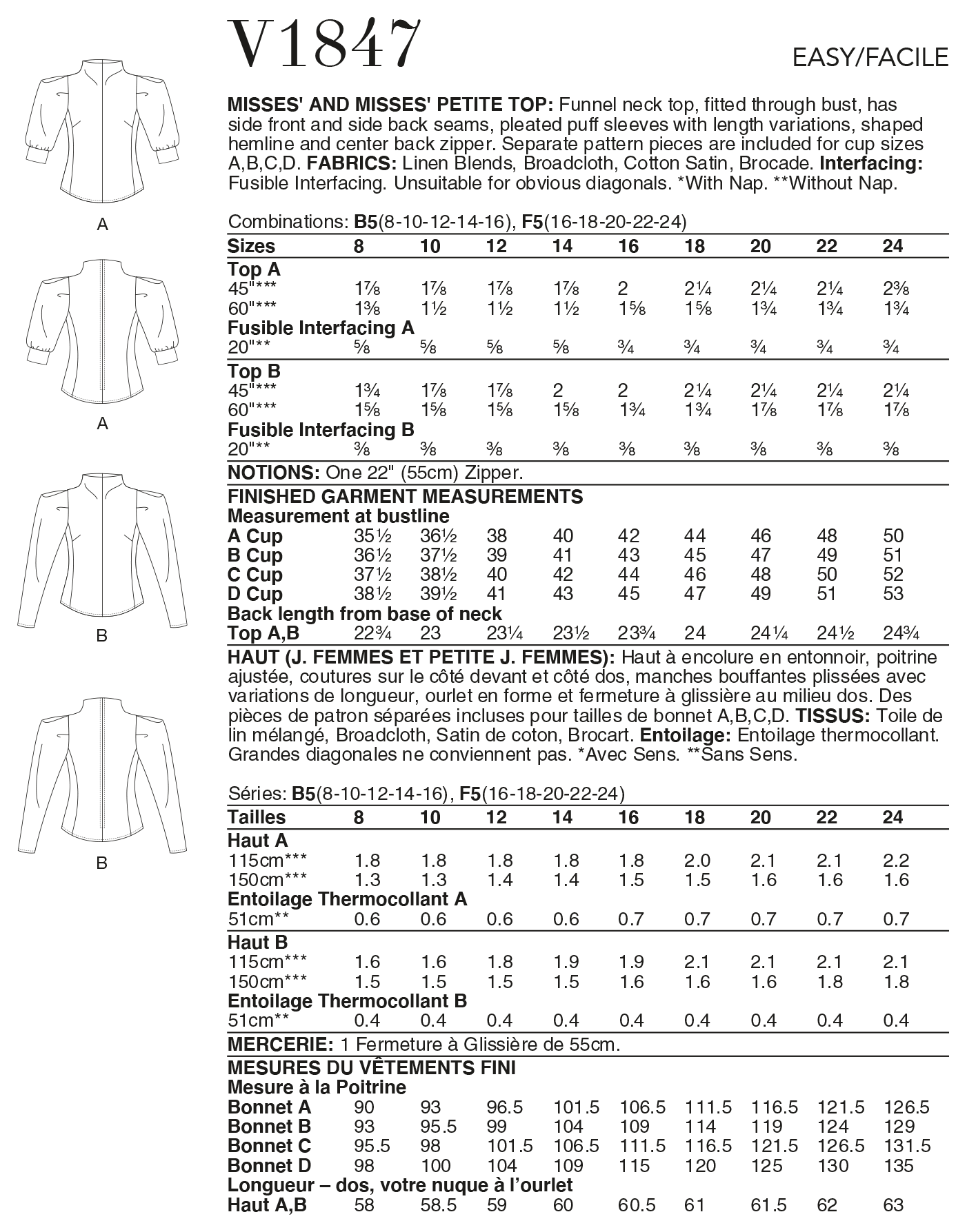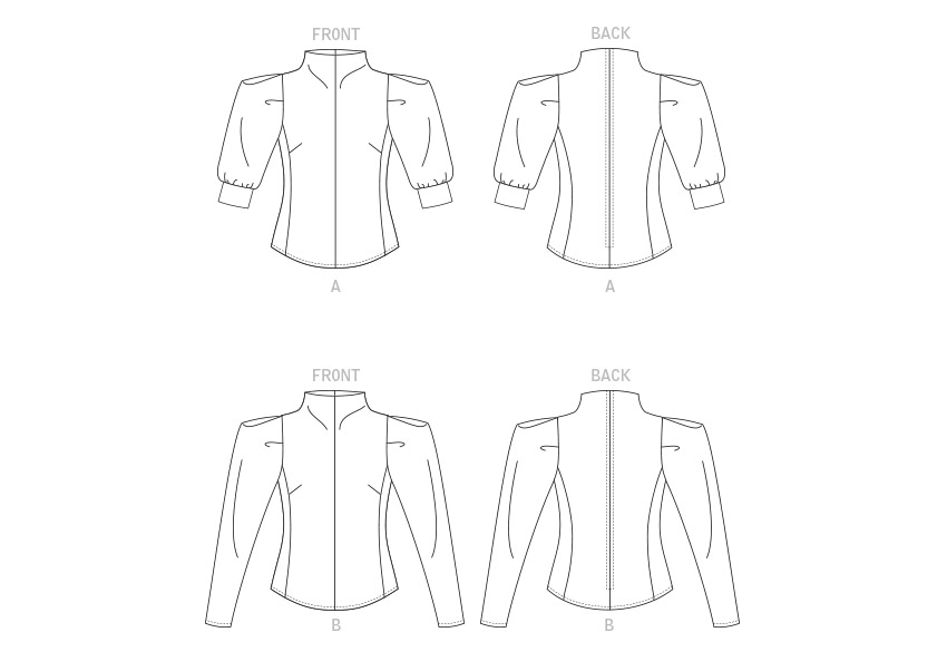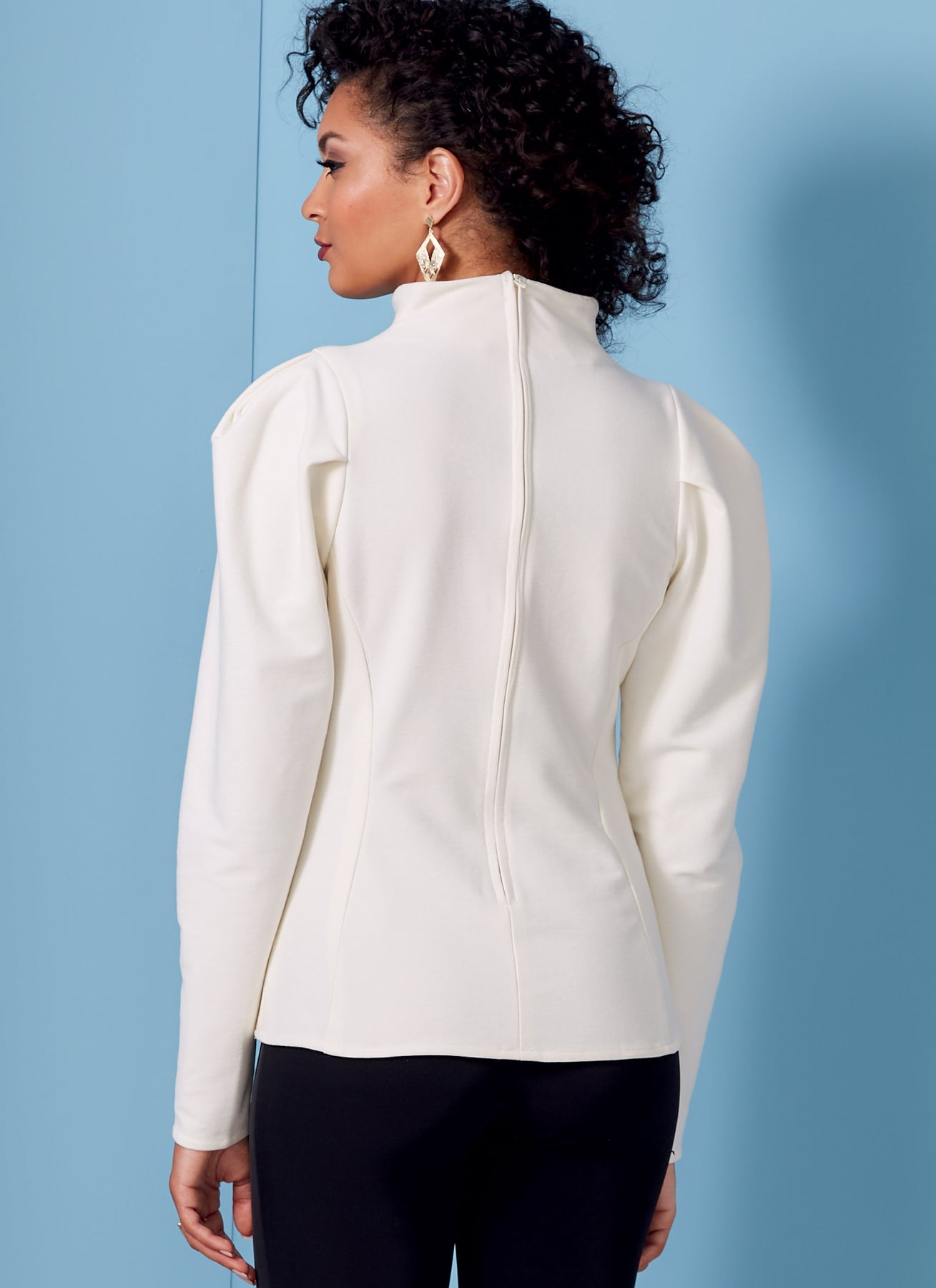 Oberteil mit Trichterausschnitt, im Brustbereich tailliert, mit seitlichen Vorder- und Rückennähten, plissierten Puffärmeln mit Längenvariationen, geformtem Saum und Reißverschluss in der Rückenmitte. Separate Schnittteile für die Körbchengrößen A, B, C und D sind enthalten.