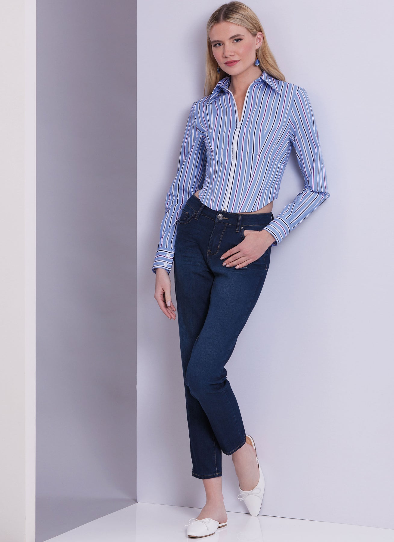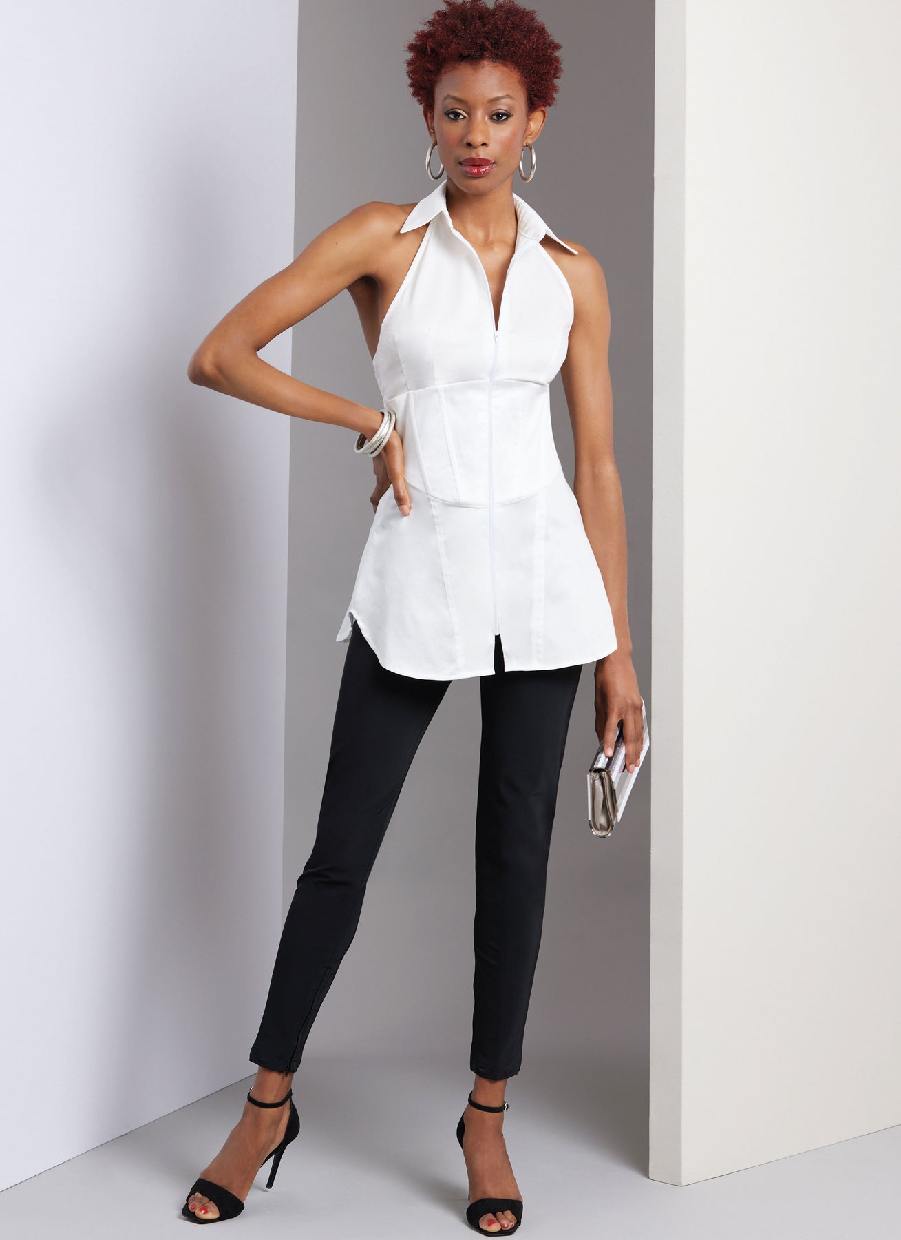 Die eng anliegenden Oberteile verfügen über ein Korsett in der Taille mit Stäbchen, einen Kragen und ein Kragenband sowie einen freiliegenden, teilbaren Reißverschluss. Ansicht A hat lange, angesetzte Ärmel, die in Knopfmanschetten mit Nahtöffnung enden. Ansicht B ist im Neckholder-Stil, hat Armausschnitte mit Schrägband und einen geformten Saum.