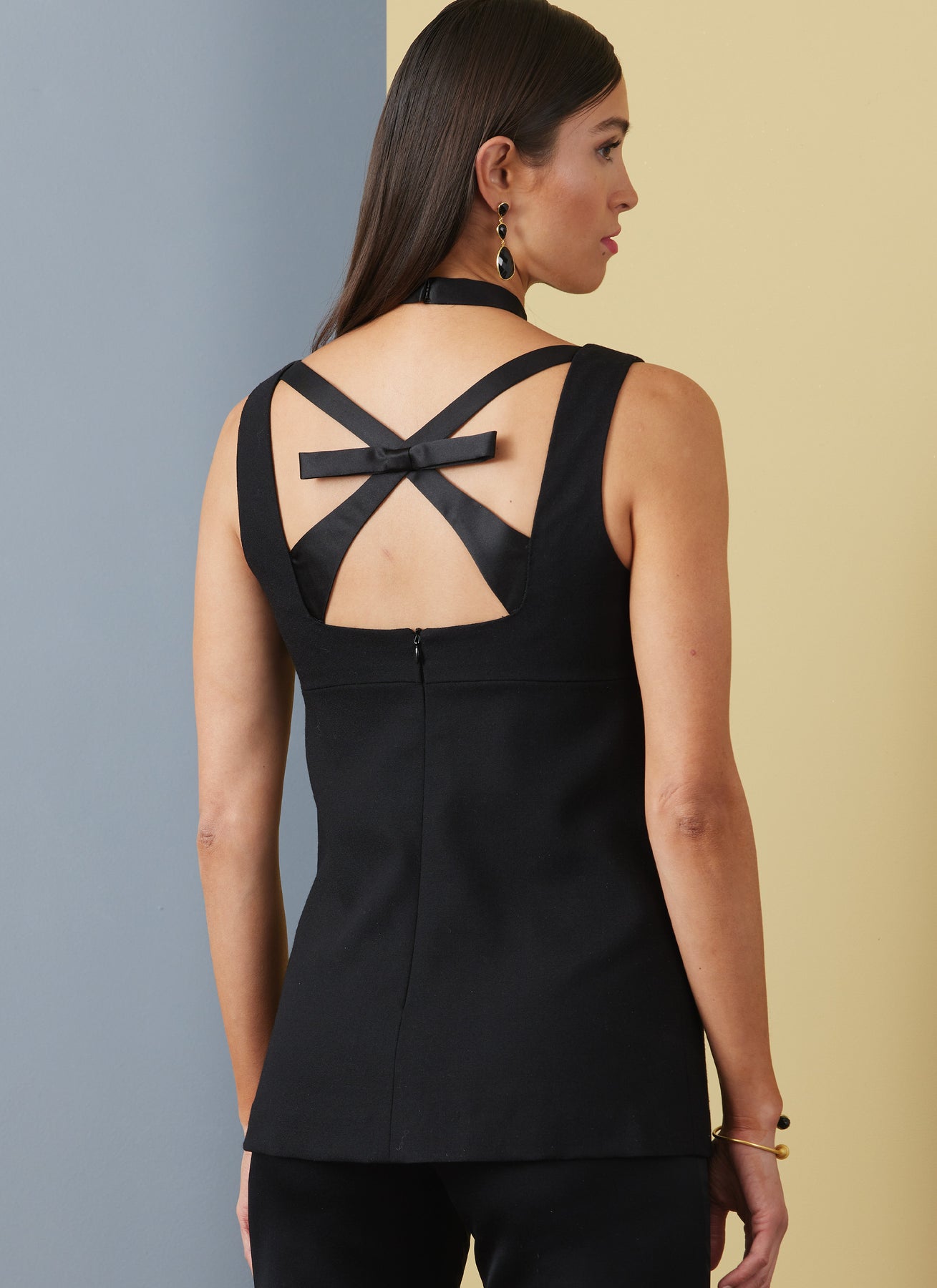 Das gefütterte, ärmellose Oberteil hat einen herzförmigen Ausschnitt mit verschlungenen Trägern und einem Schleifendetail auf der oberen Brust. Das Oberteil hat eine Empire-Naht, Brustabnäher und einen unsichtbaren Rückenreißverschluss. Ansicht A hat einen Kontrast an den Trägern und der Schleife.