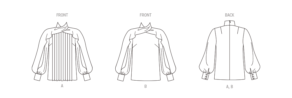 Halb tailliertes Oberteil mit Rundhalsausschnitt, langen Flügelärmeln, Ärmelöffnung mit durchgehendem Schoß, Knopfmanschetten, Brustabnähern und Baby-Saum. Ansicht A hat eine plissierte Vorderseite. Ansicht B hat eine einfarbige Vorderseite.