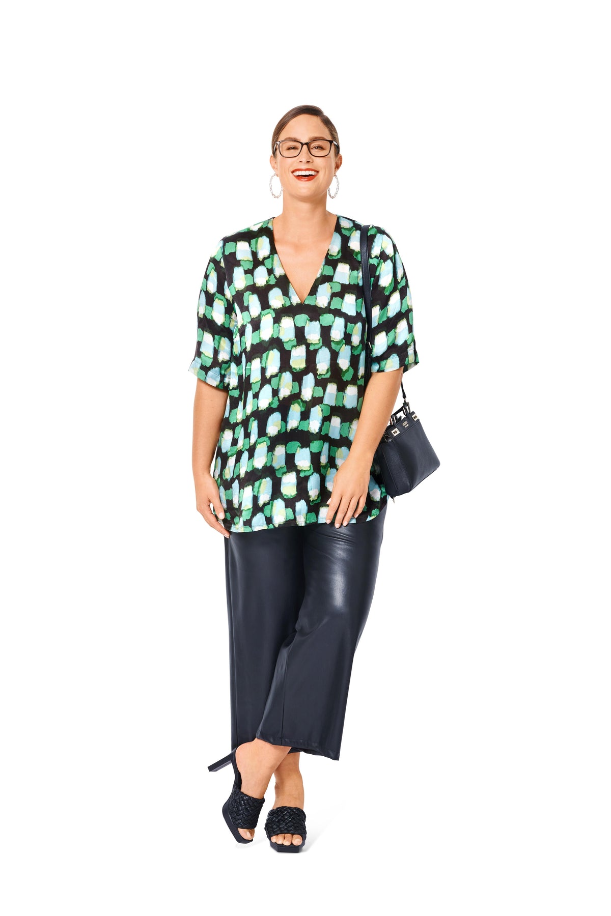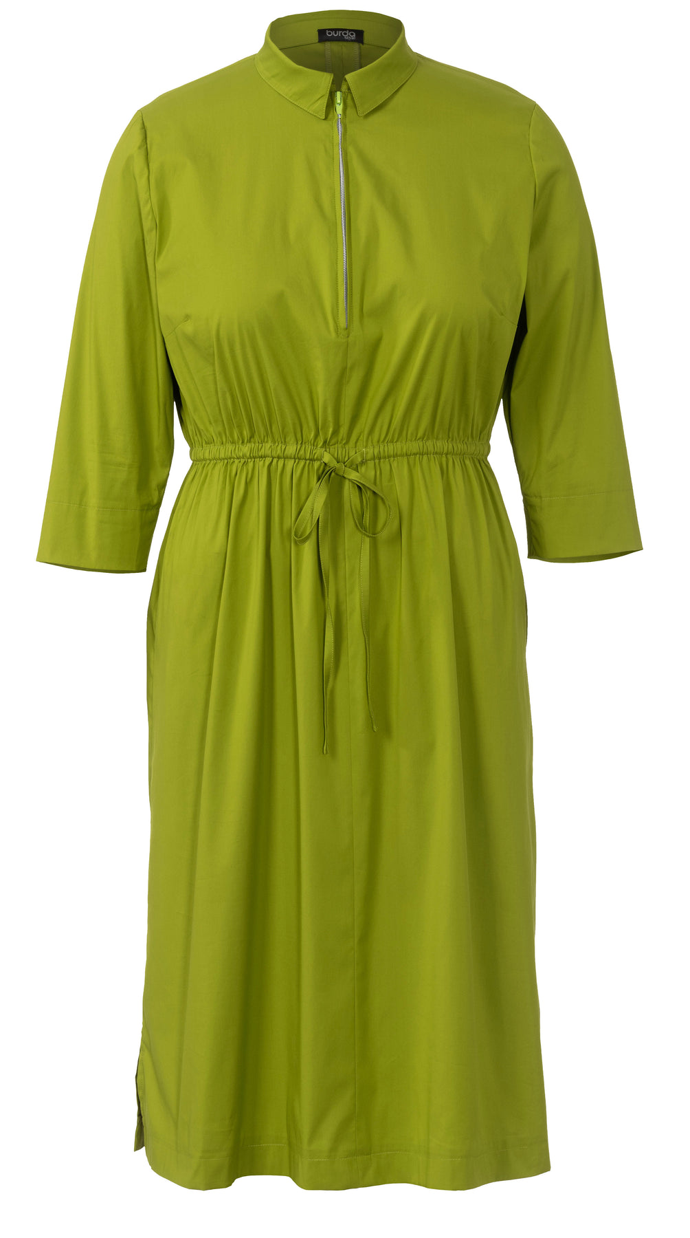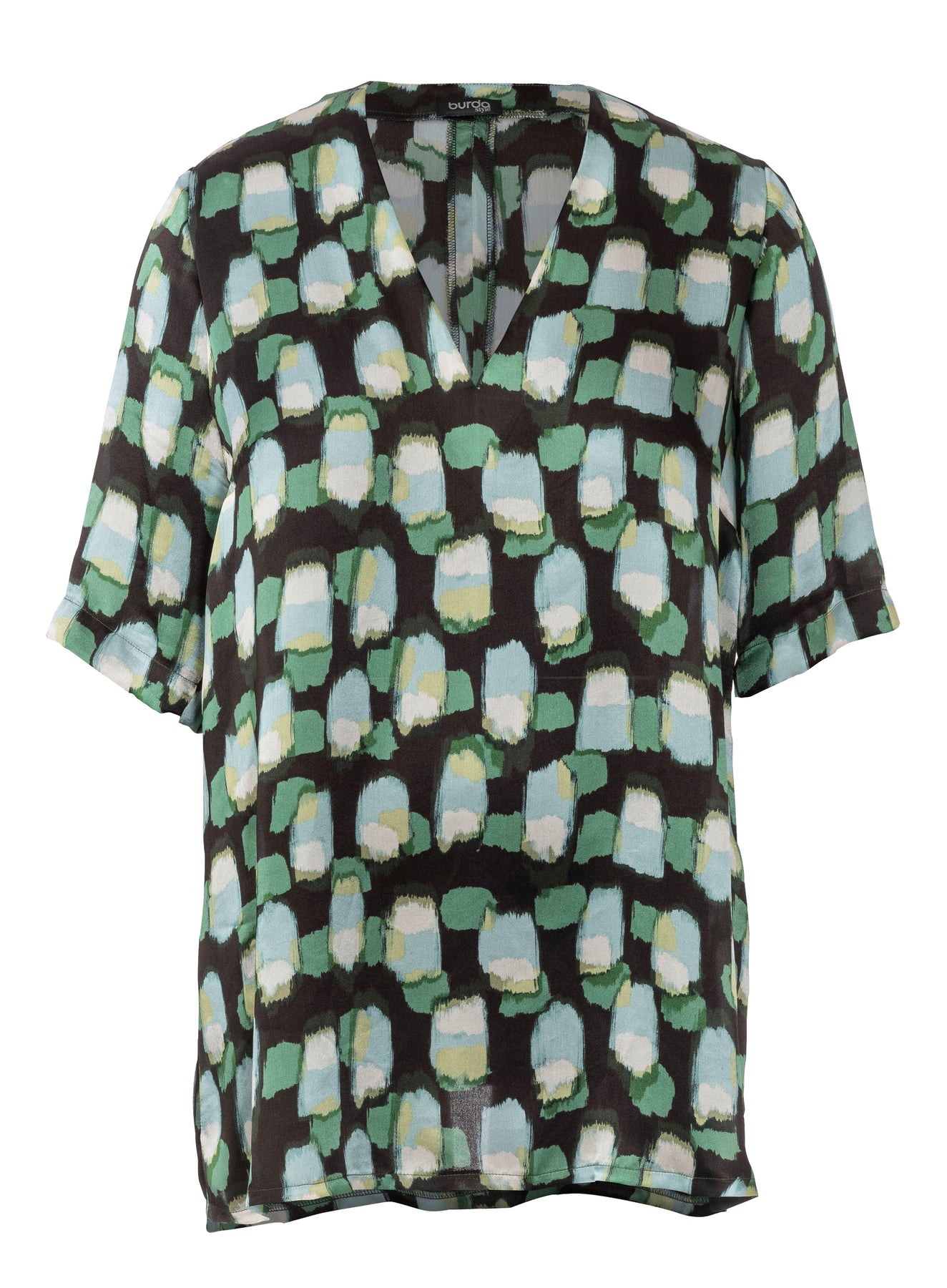 Hemdblusenkleider sind wieder sehr aktuell. Hier finden Sie ein sportives Modell mit vord. Reißverschluss, kleinem Kragen, Banddurchzug in der Taille und 3/4 Ärmeln in Uni. Bei der legeren Bluse mit V-Ausschnitt und weiten, halblangen Ärmeln kommt Print gut zur Geltung. Zur Zeit sind plakative Muster sehr en Vogue.