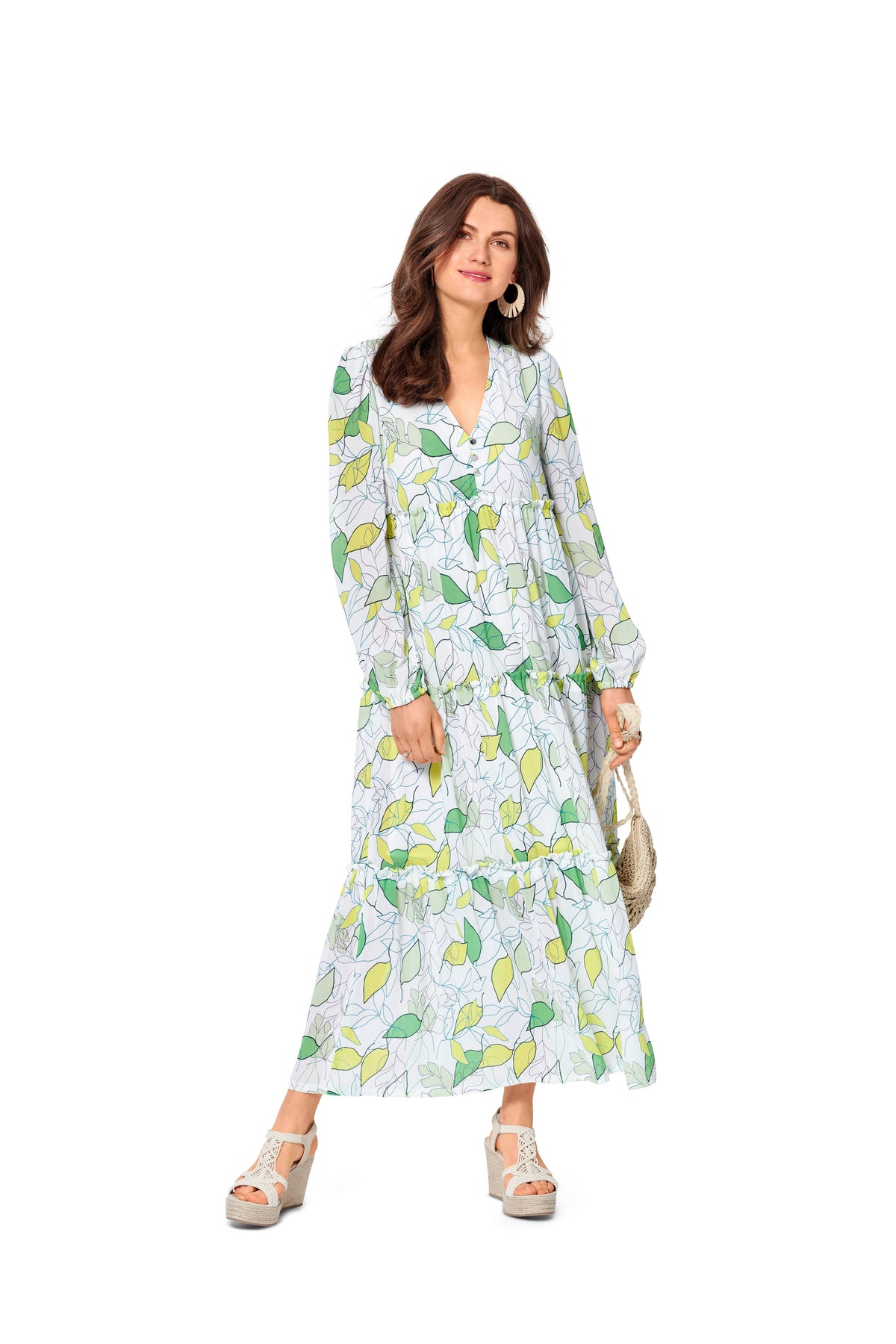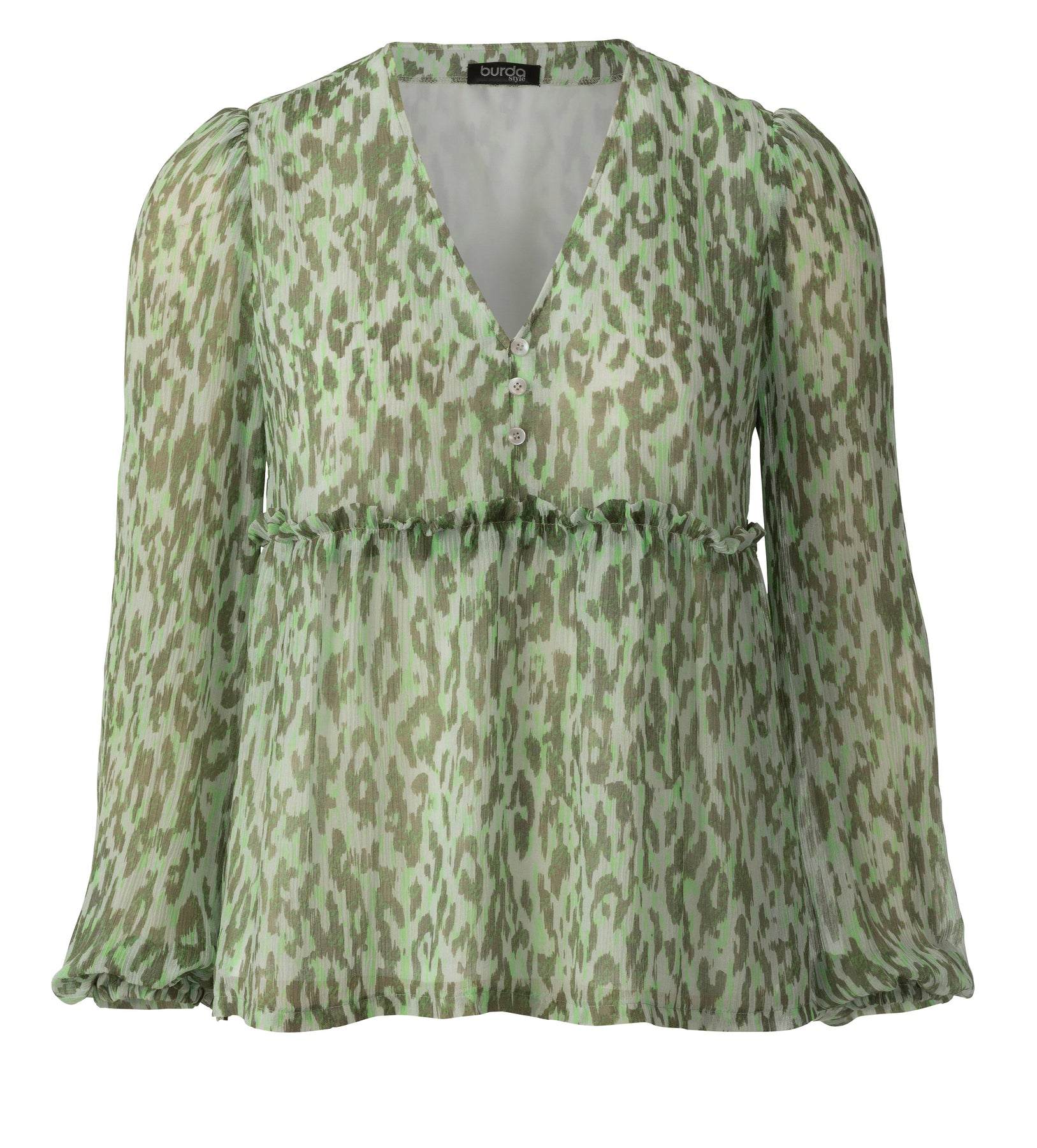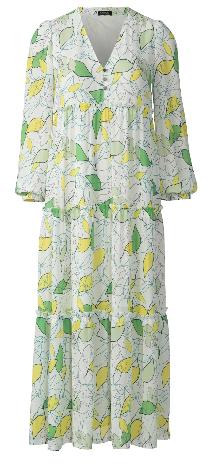 Schön, dass Stufenkleider bzw. -blusen wieder in den Fokus der Mode geraten. Sie sind herrlich feminin, luftig und bequem zugleich. Der V-Ausschnitt mit den kleinen Zierknöpfen schmeichelt jedem Dekolleté.
