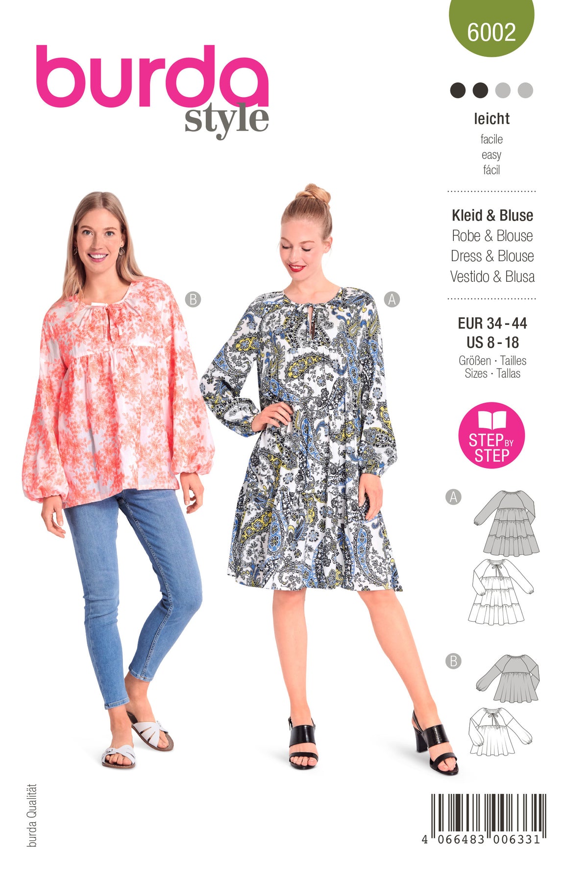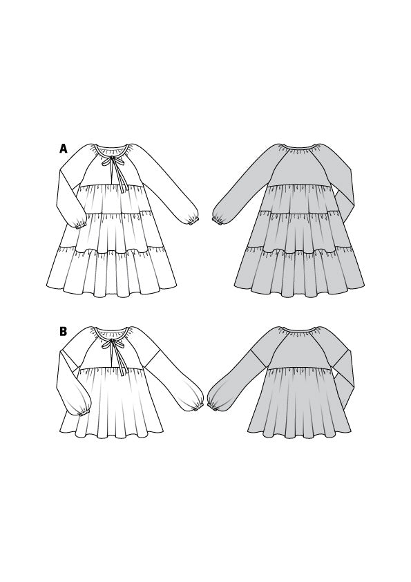 Diese luftigen Begleiter geben im Sommer viel Bewegungsfreiheit und sind mega angesagt. Das Kleid mit drei üpppigen Rockstufen hat schwungvolle Weite. Die Bluse hat ausgestellte Ärmel, die unten mit einem Gummiband zusammengehalten werden. Beide Modelle mit Raglanärmeln, vord. Schlitz und Bindeband.