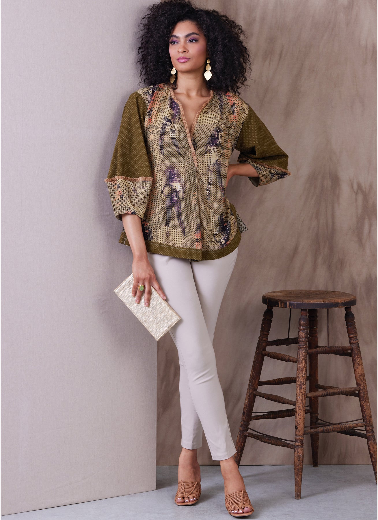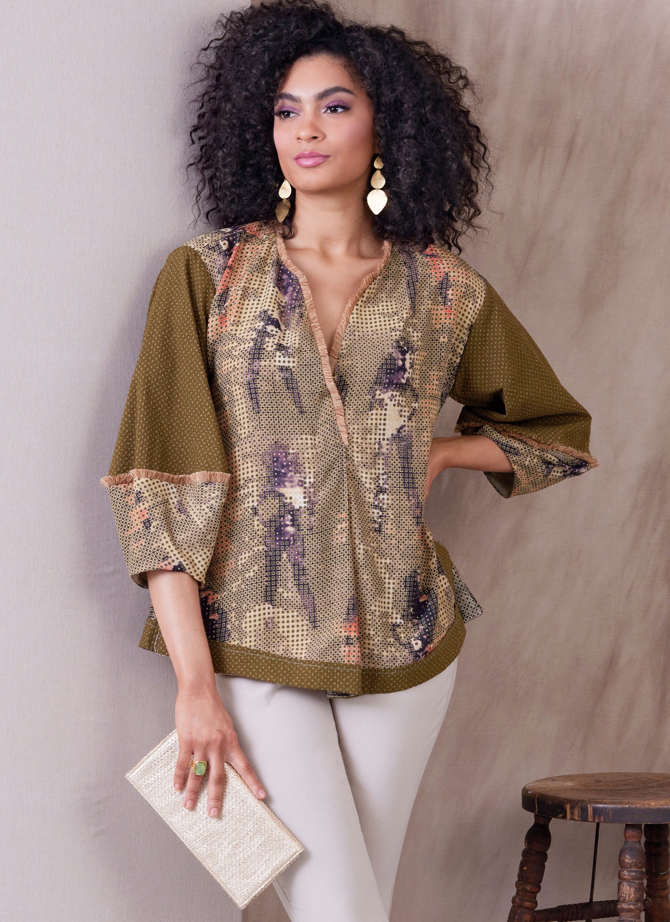 Kleid oder Tunika in A-Linie mit Falten vorne und Rückenpasse. Das Kleid hat Seitennahttaschen, Kontrastkragen und -manschetten sowie Saumabschlüsse. Tunika mit Laternenärmeln, kontrastierenden Oberärmeln, Passe und außen angenähten Saumabschlüssen. Gekaufter Fransenbesatz.