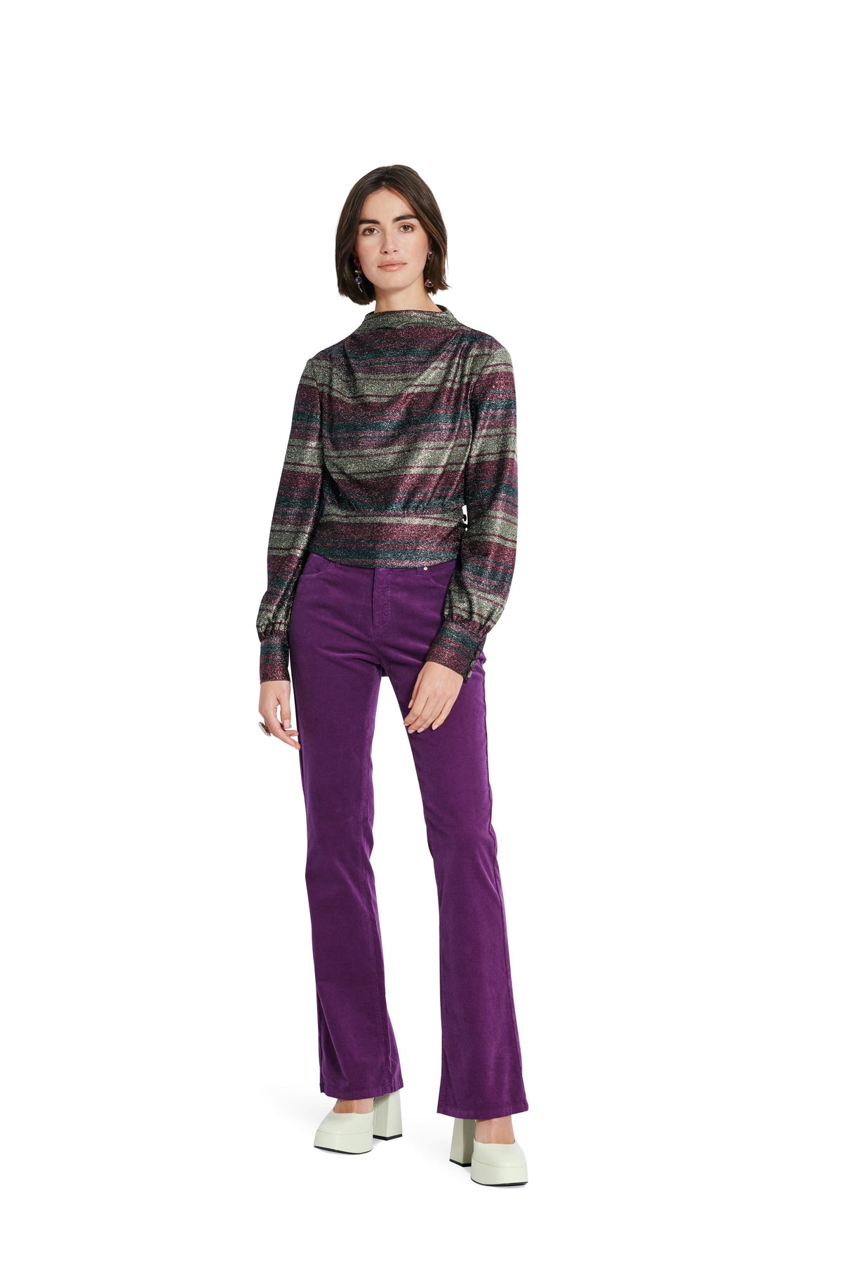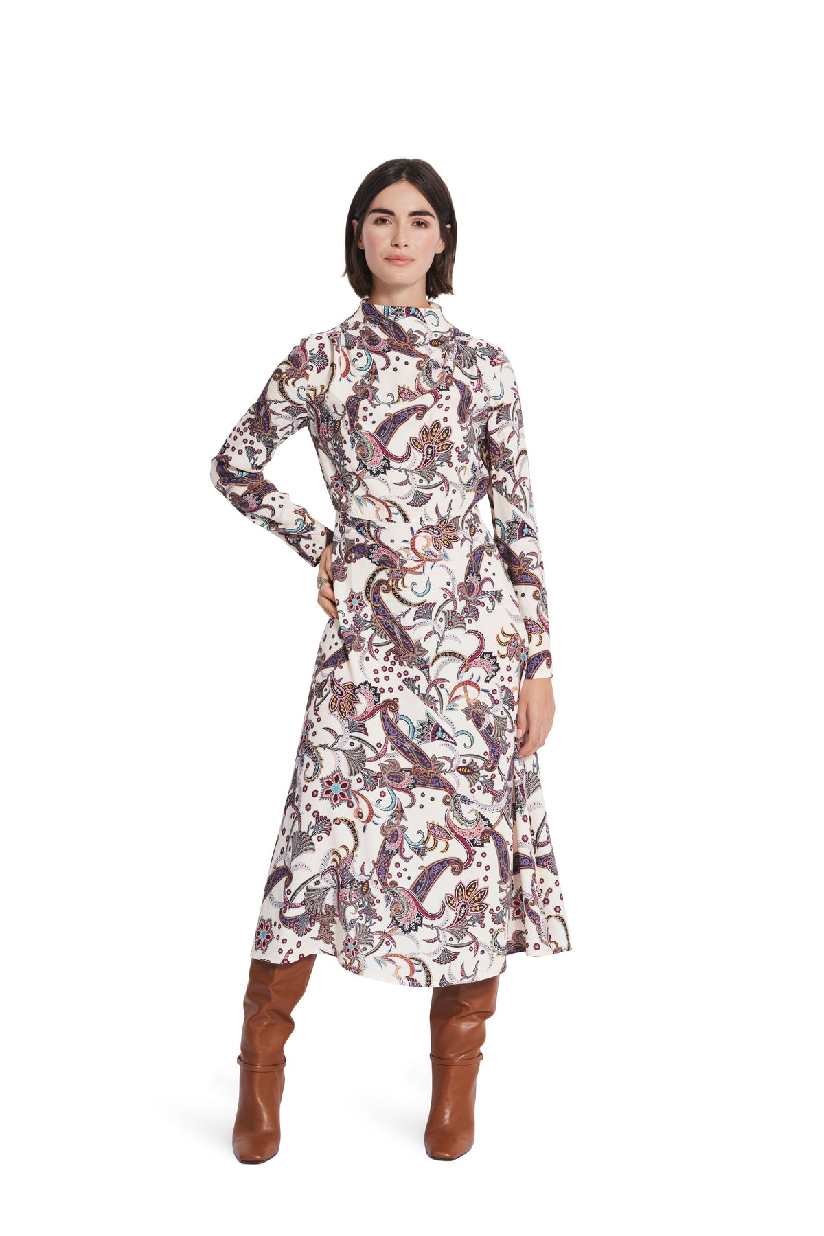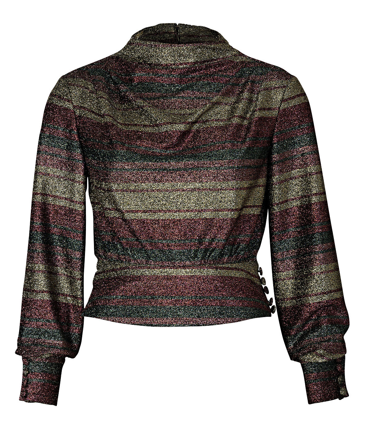 Bei diesem Kleid und der Bluse machen die asymmentrischen Falten, die aus der Schulternaht kommend die Weite am Vorderteil geben und der Turtleneckkragen den Look. Das Kleid hat einen weit schwingenden Rock und schmale lange Ärmel. Die Bluse gefällt mit kleinem Schößchen und Manschettenärmeln.