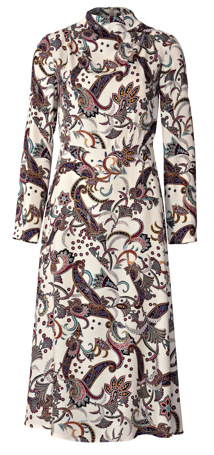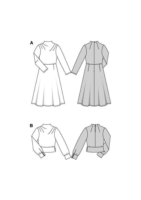 Stoffempfehlung:Baumwollstoffe, Kreppstoffe, Viskose AB: aufbügelbare Einlage. A: 1 nahtverdeckter Reißverschluss, 60 cm lang. B: 1 nahtverdeckter Reißverschluss, 22 cm lang. 15 Knöpfe.