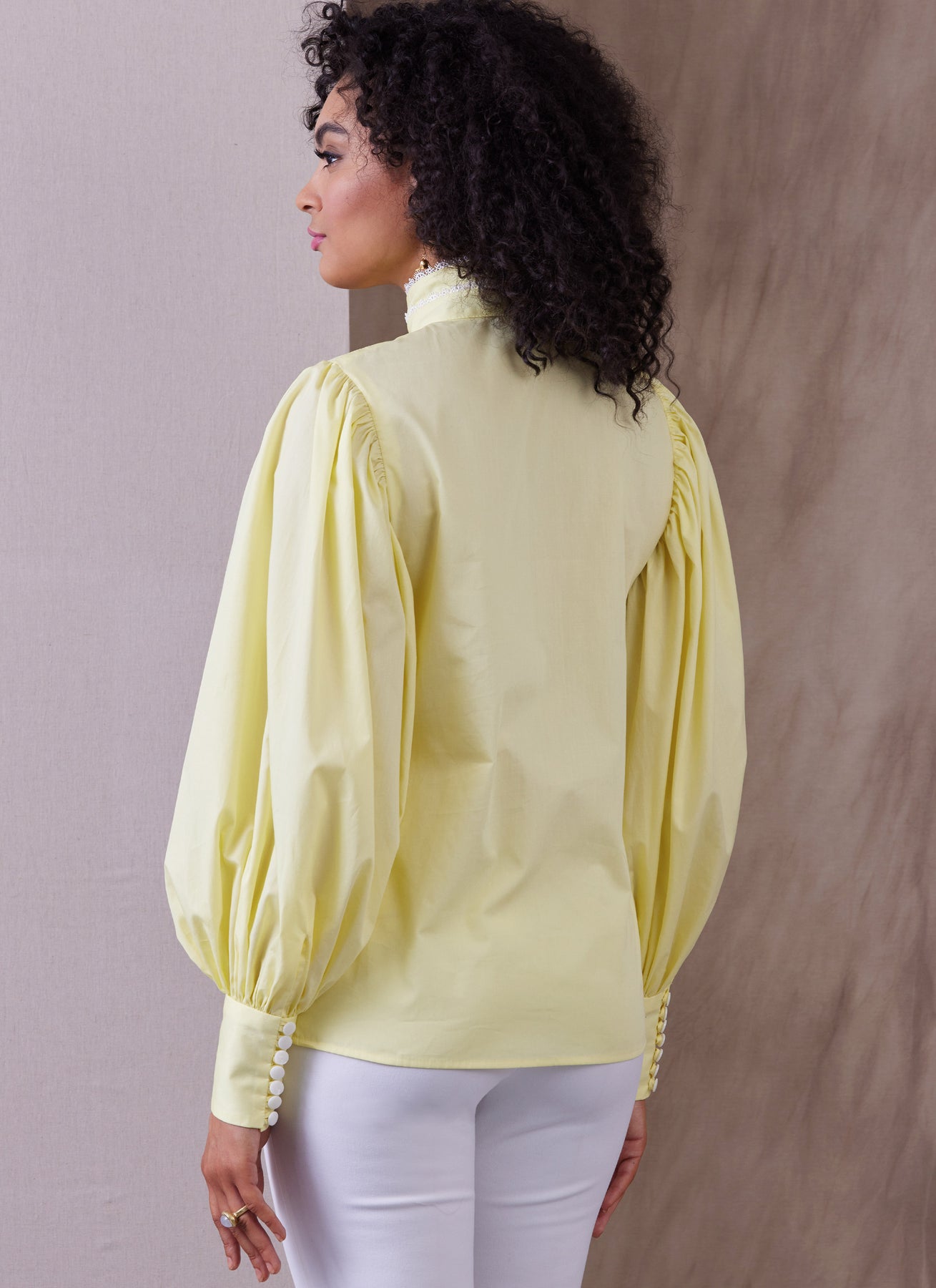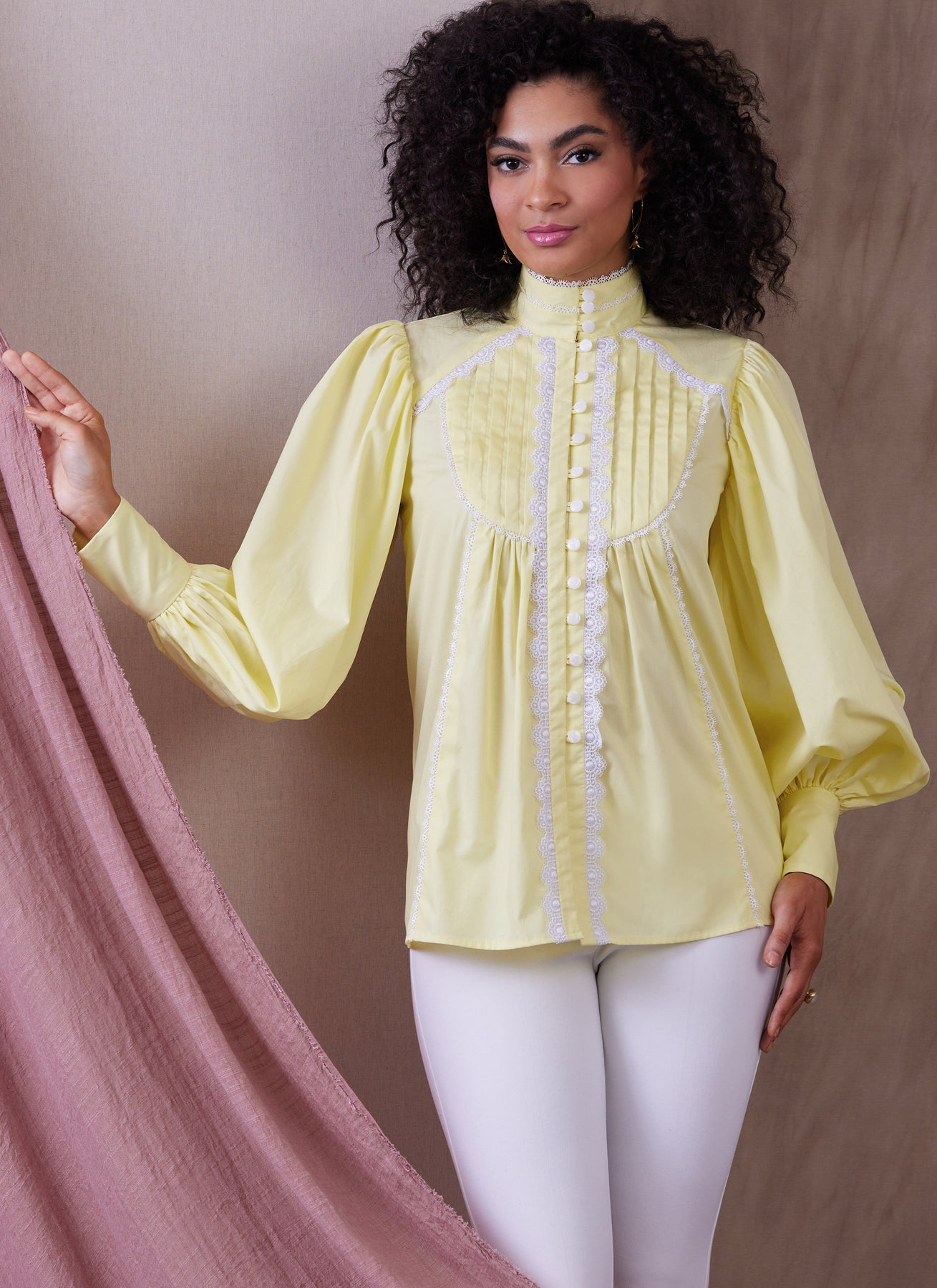 Locker sitzendes Oberteil mit gerafften Ärmeln und Knopf mit Schrägbandverschluss vorne. Ansicht A ist tailliert und hat eine elastische Taille, Bindebänder vorne und Dreiviertel-Ärmel mit elastischen Säumen. Ansicht B hat lange Ärmel, Manschetten mit Knopf und Schrägbandschlaufe, eine durchgehende Öffnung im Schoß und Spitzenbesatz.