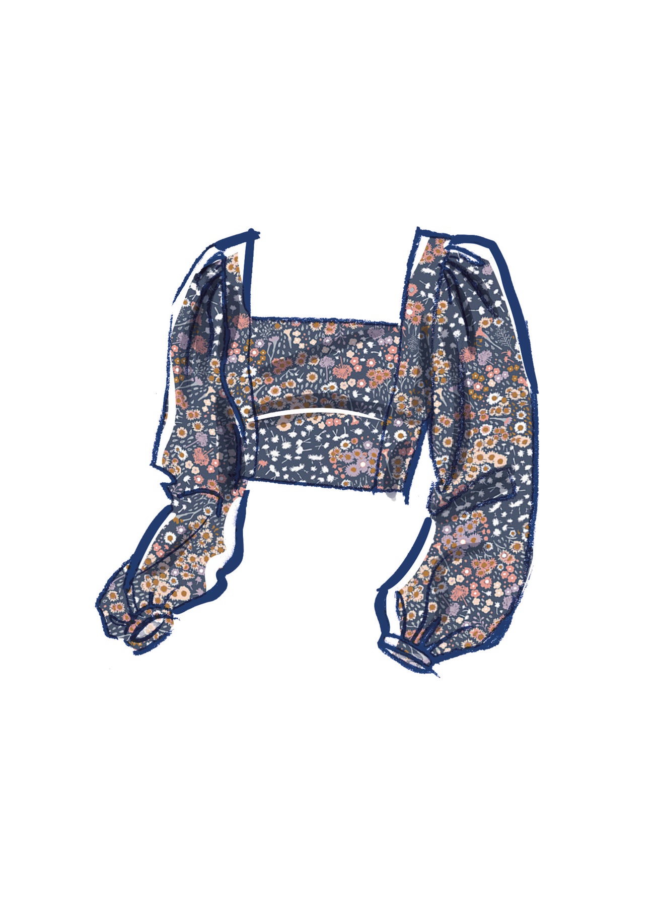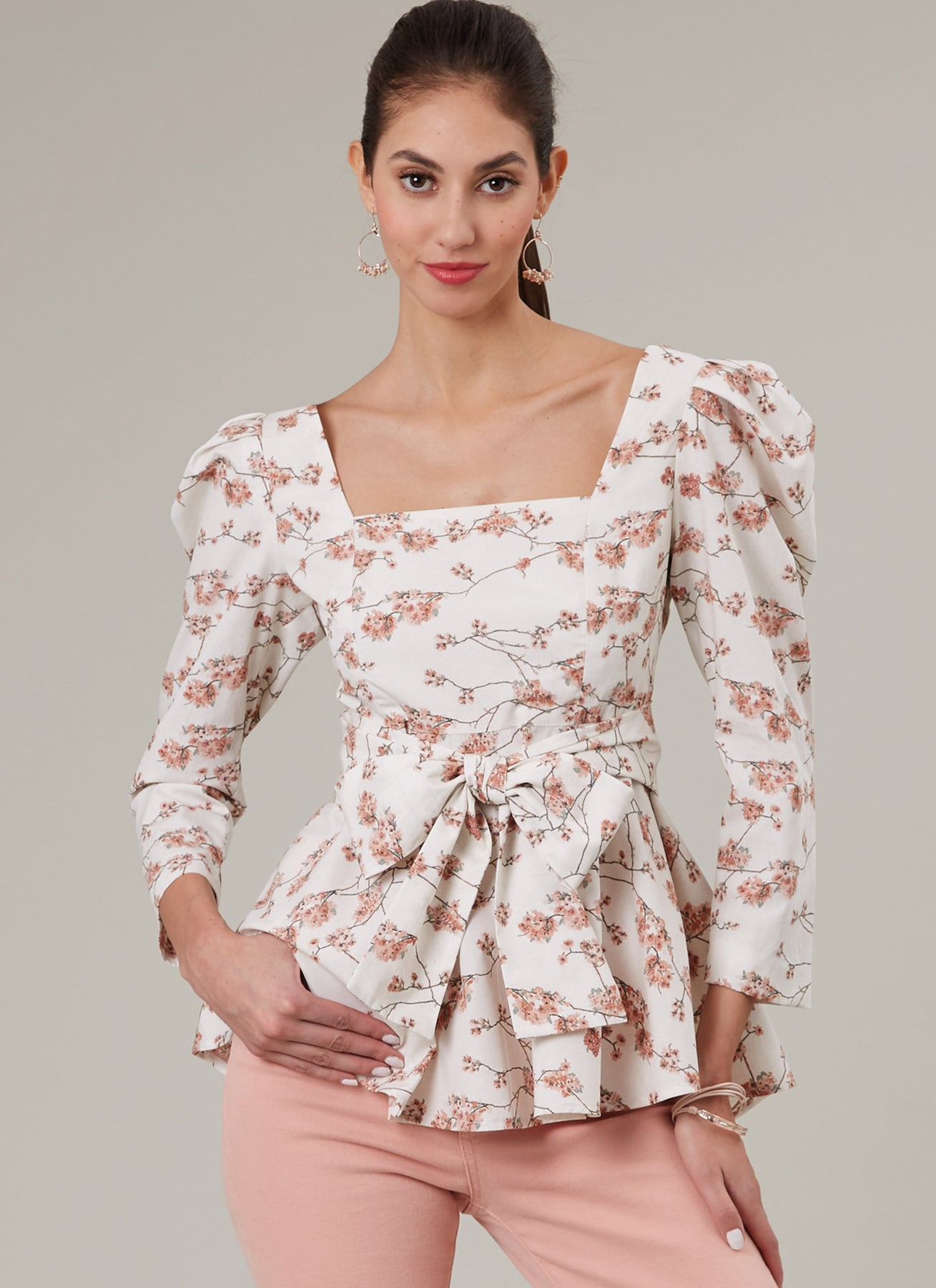 Oberteile mit Ärmeln oder Trägern haben einen quadratischen Ausschnitt, Raffungen und einen Reißverschluss am Rücken. Ansicht A ist ein Crop-Top. Ansicht D hat Schulterfalten und eine Schärpe.