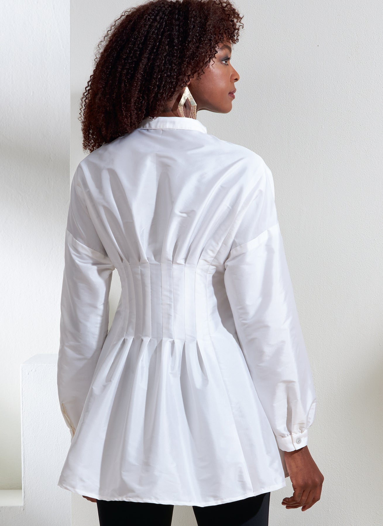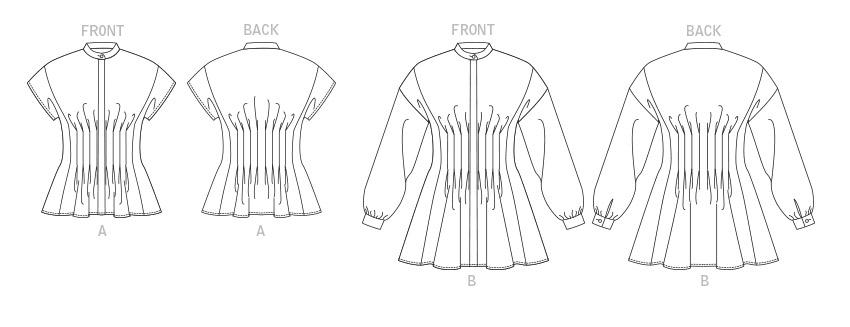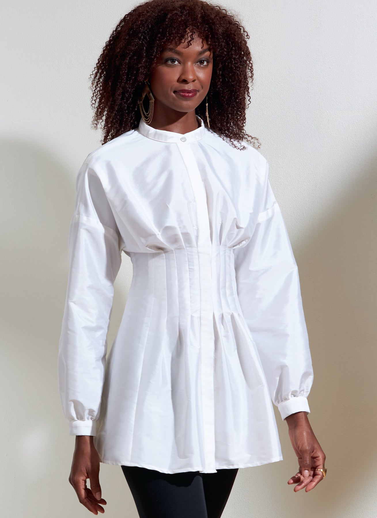 Das leicht ausgestellte Oberteil zeichnet sich durch 1" breite Biesen vorne und hinten, ein Kragenband sowie seitliche Vorder- und Rückennähte aus. Ein verdeckter Knopfverschluss vorne und schmale Säume verleihen dem Design eine elegante Note. Ansicht A ist hüftlang, ärmellos und mit schmalen Säumen gestaltet, während Ansicht B tunikaförmig ist, lange Ärmel mit Knopfmanschetten besitzt und eine durchgehende Öffnung im Schoß aufweist. Ein vielseitiges Oberteil, das Komfort und Stil perfekt verbindet.