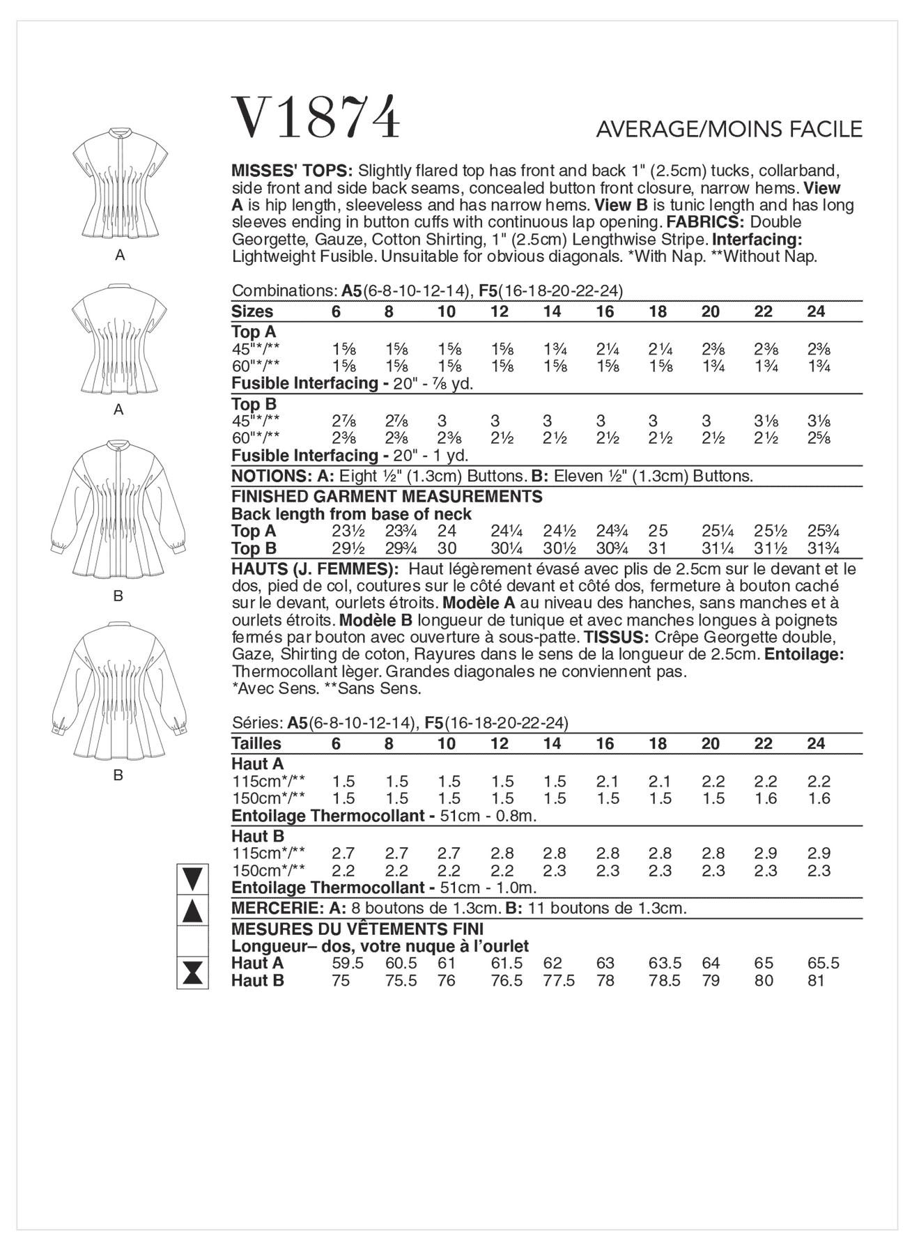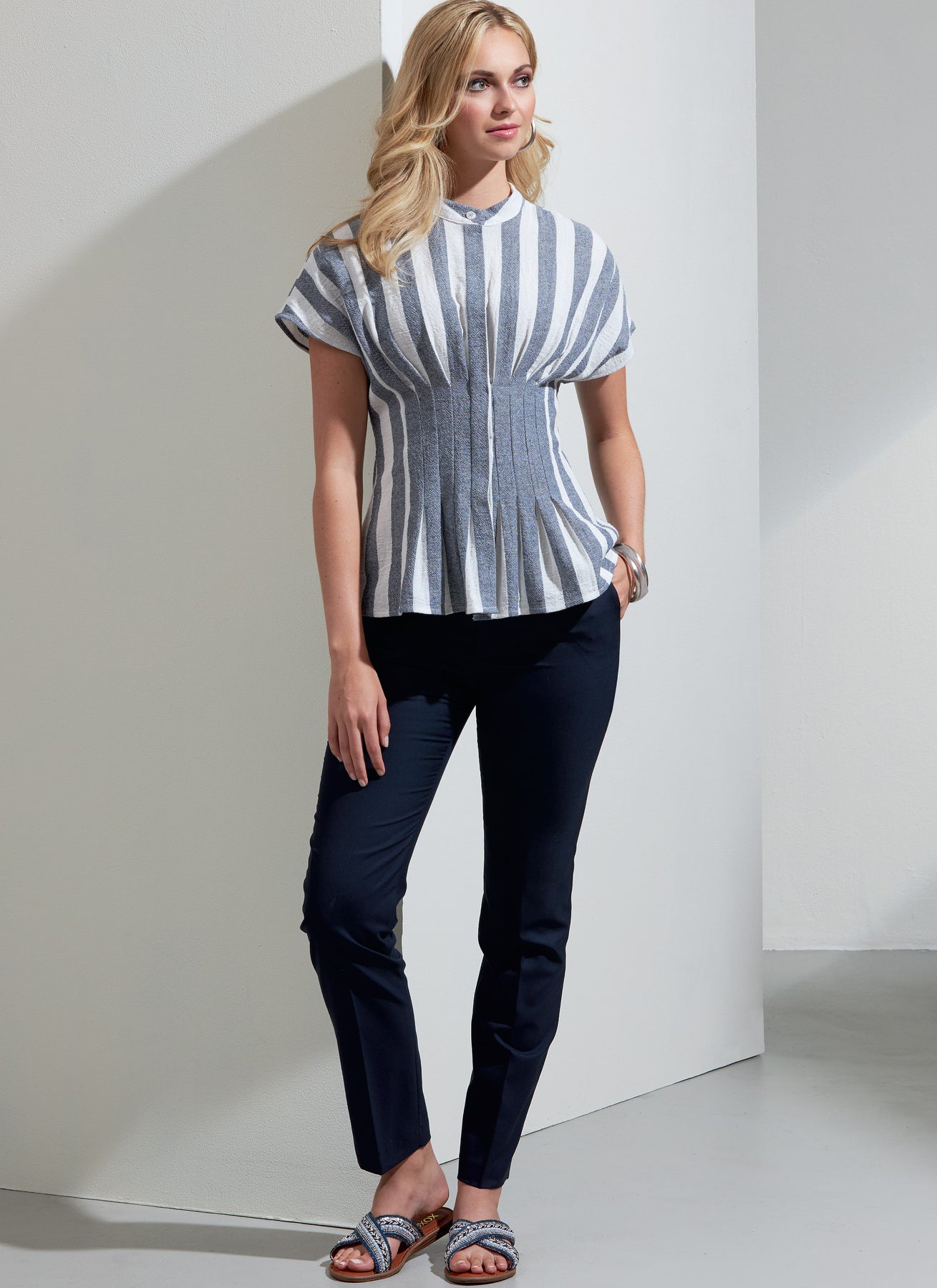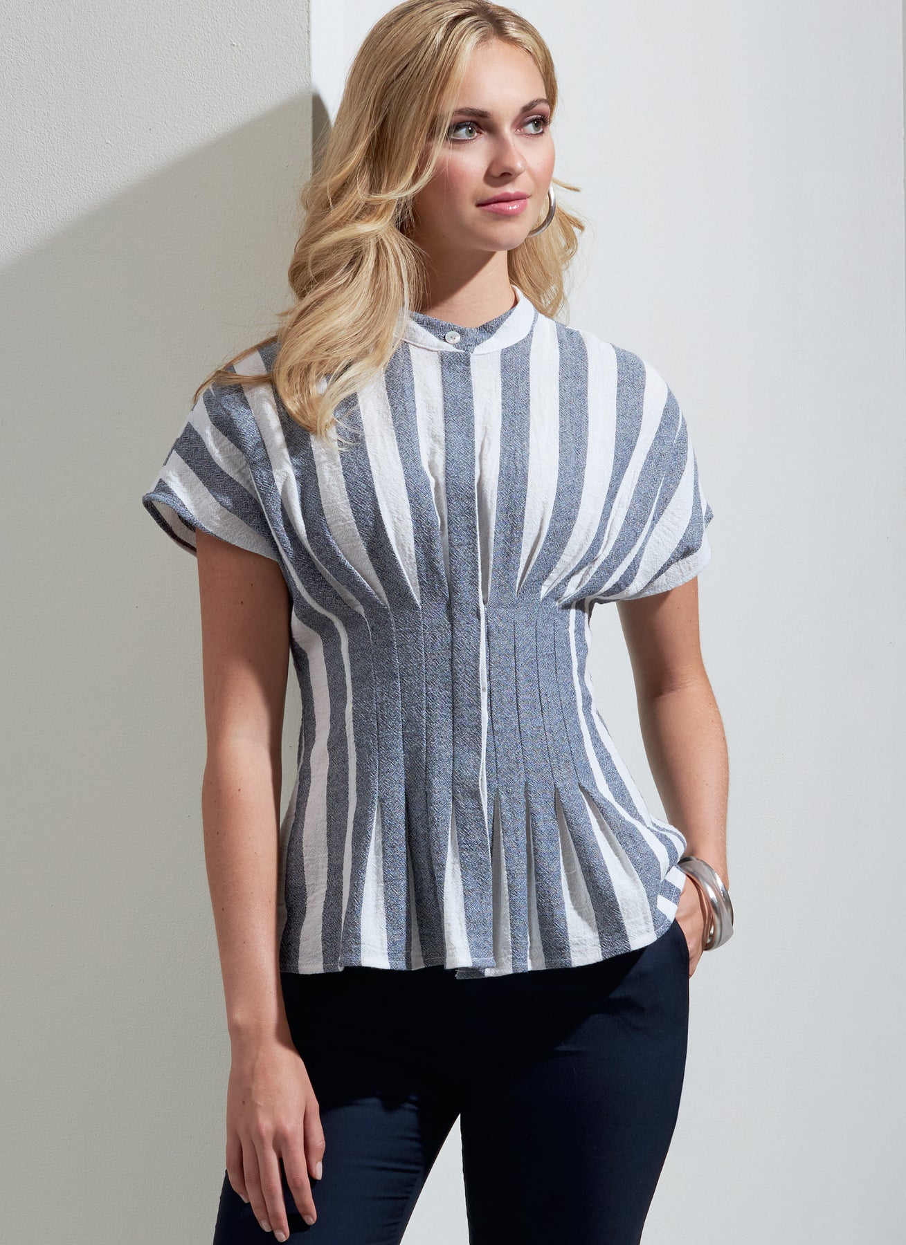 Das leicht ausgestellte Oberteil zeichnet sich durch 1" breite Biesen vorne und hinten, ein Kragenband sowie seitliche Vorder- und Rückennähte aus. Ein verdeckter Knopfverschluss vorne und schmale Säume verleihen dem Design eine elegante Note. Ansicht A ist hüftlang, ärmellos und mit schmalen Säumen gestaltet, während Ansicht B tunikaförmig ist, lange Ärmel mit Knopfmanschetten besitzt und eine durchgehende Öffnung im Schoß aufweist. Ein vielseitiges Oberteil, das Komfort und Stil perfekt verbindet.