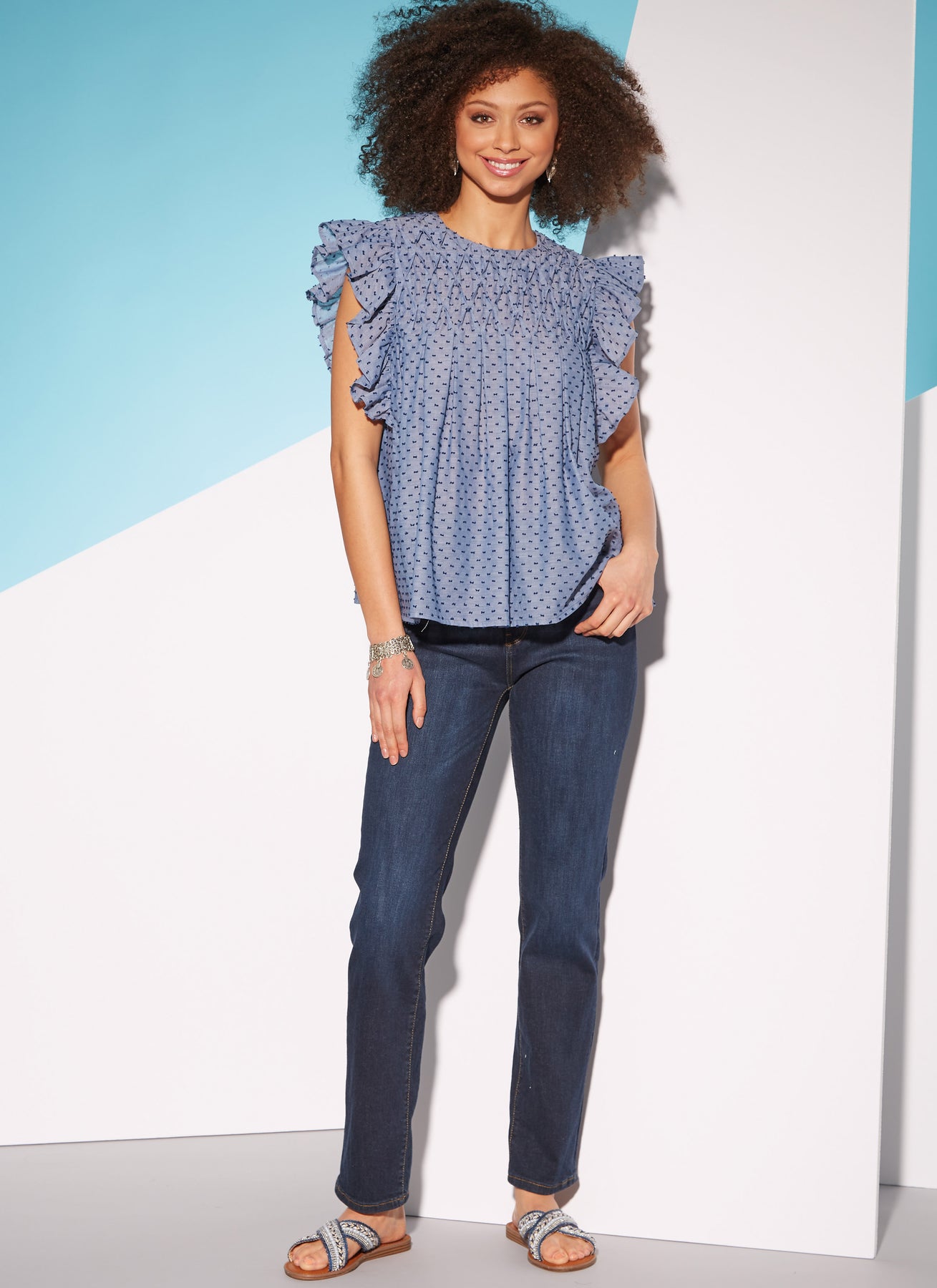 Lernen Sie, Biesen zu nähen! Pulloverblusen mit Biesen haben eine Öffnung am Rücken. Ansicht A Biesen werden waagerecht in abwechselnden Richtungen genäht. Die Oberteile haben Rüschen, kurze und Puffärmel. Ansicht C hat eine untere Rüsche.