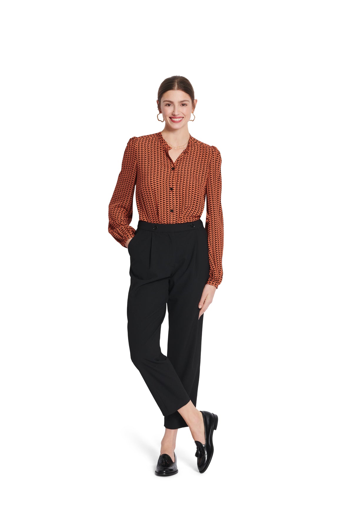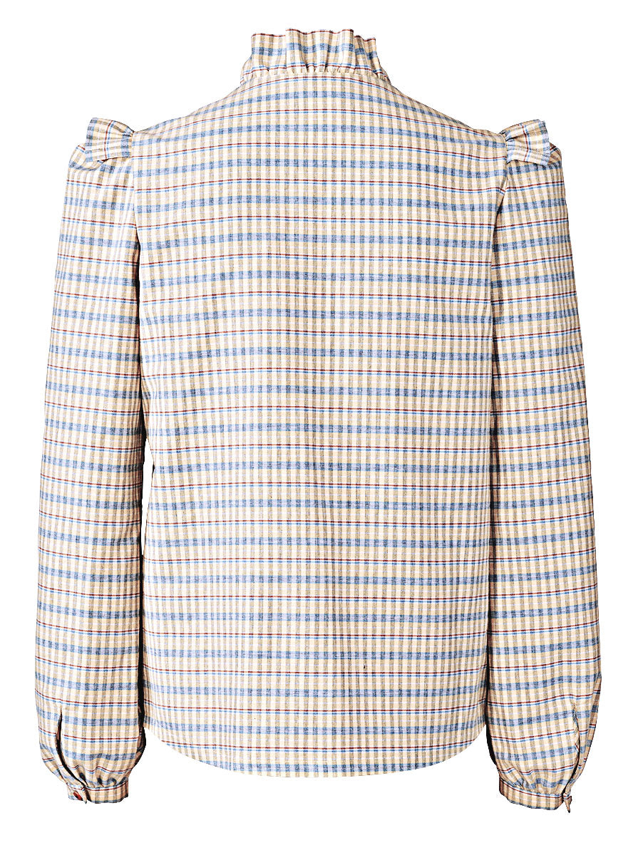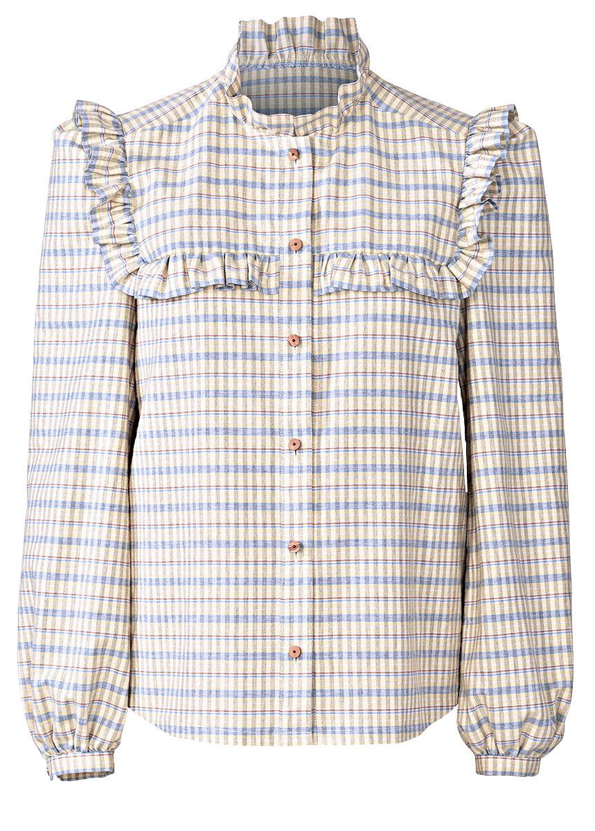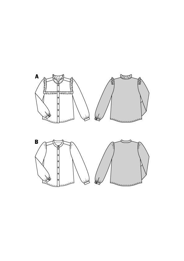Schöne Blusen mit eingereihten Ärmeln und schmalen Manschetten. Für den romantischen Look sorgen bei Bluse A Rüschen, die in der Passe und entlang der Ärmelkugel mitgefasst werden. Als Kragen hat sie eine breite Rüsche. Die schlichtere Variante B hat einen Stehkragen.