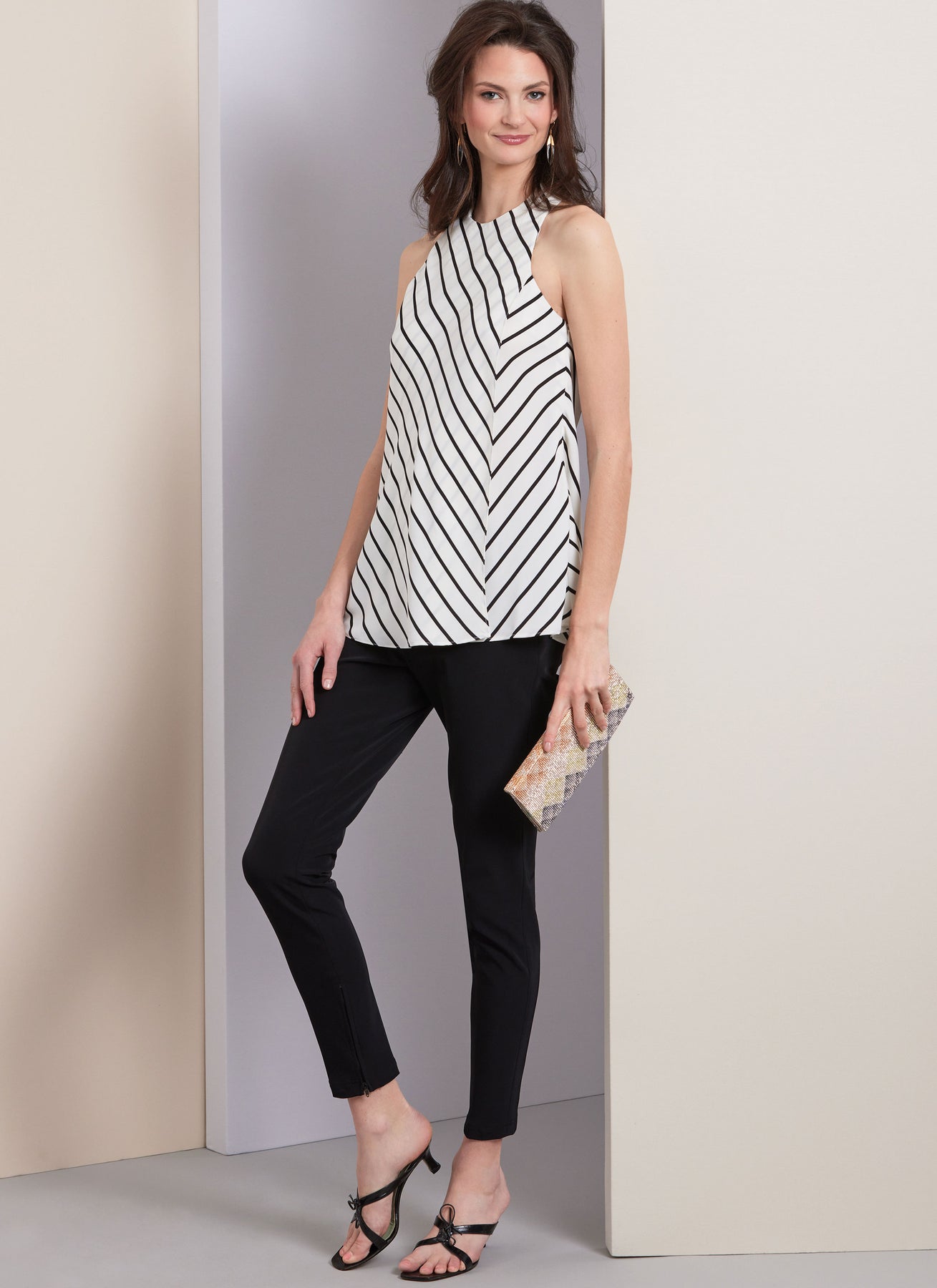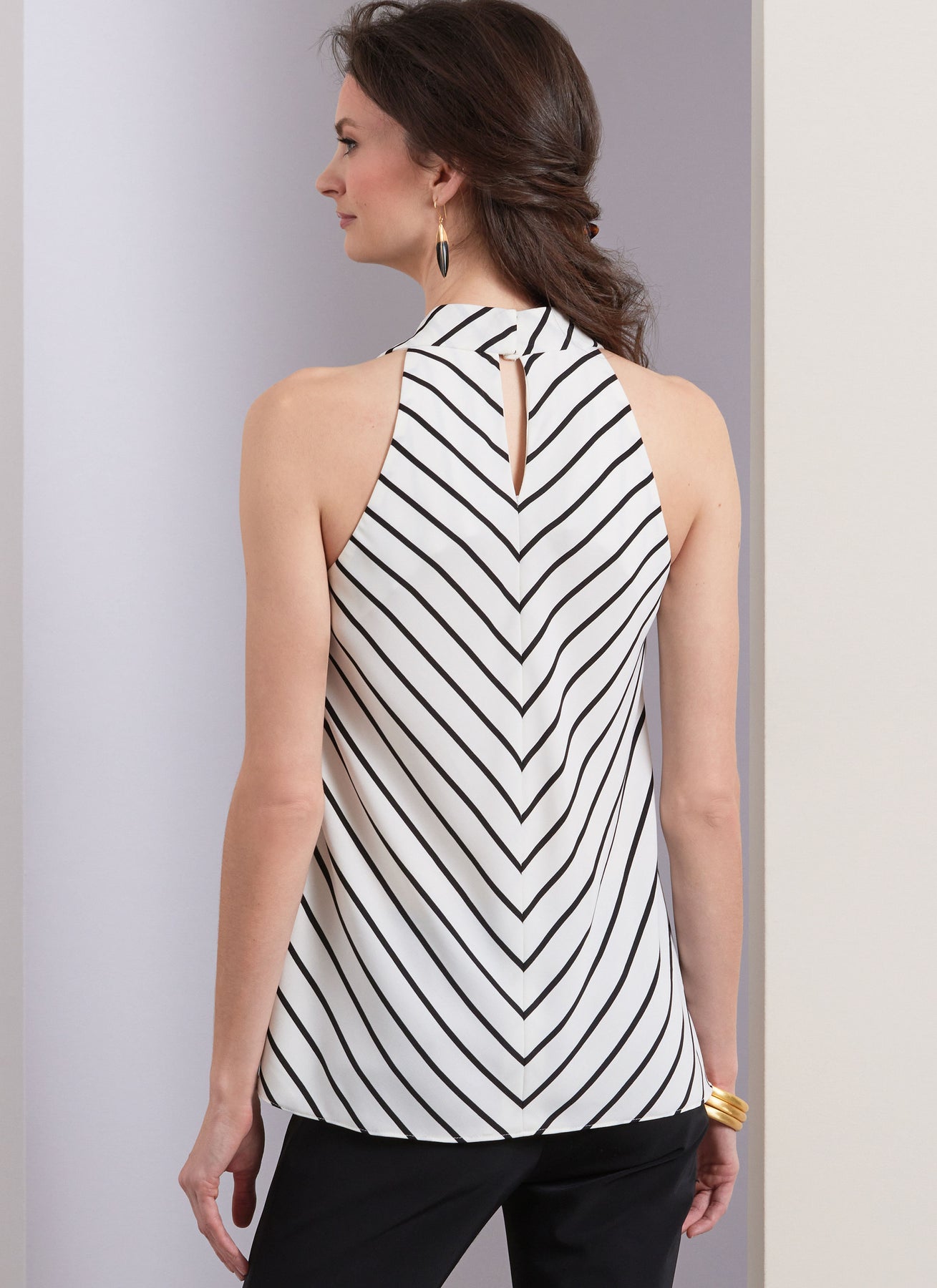 Die schräg geschnittenen Oberteile haben geschichtete Vorderseiten, einen unsichtbaren Seitenreißverschluss, Haken- und Ösenverschluss im Nacken, Hals- und Armausschnittblenden und Babysäume. Ansicht B hat am Rücken einen Schlitz.